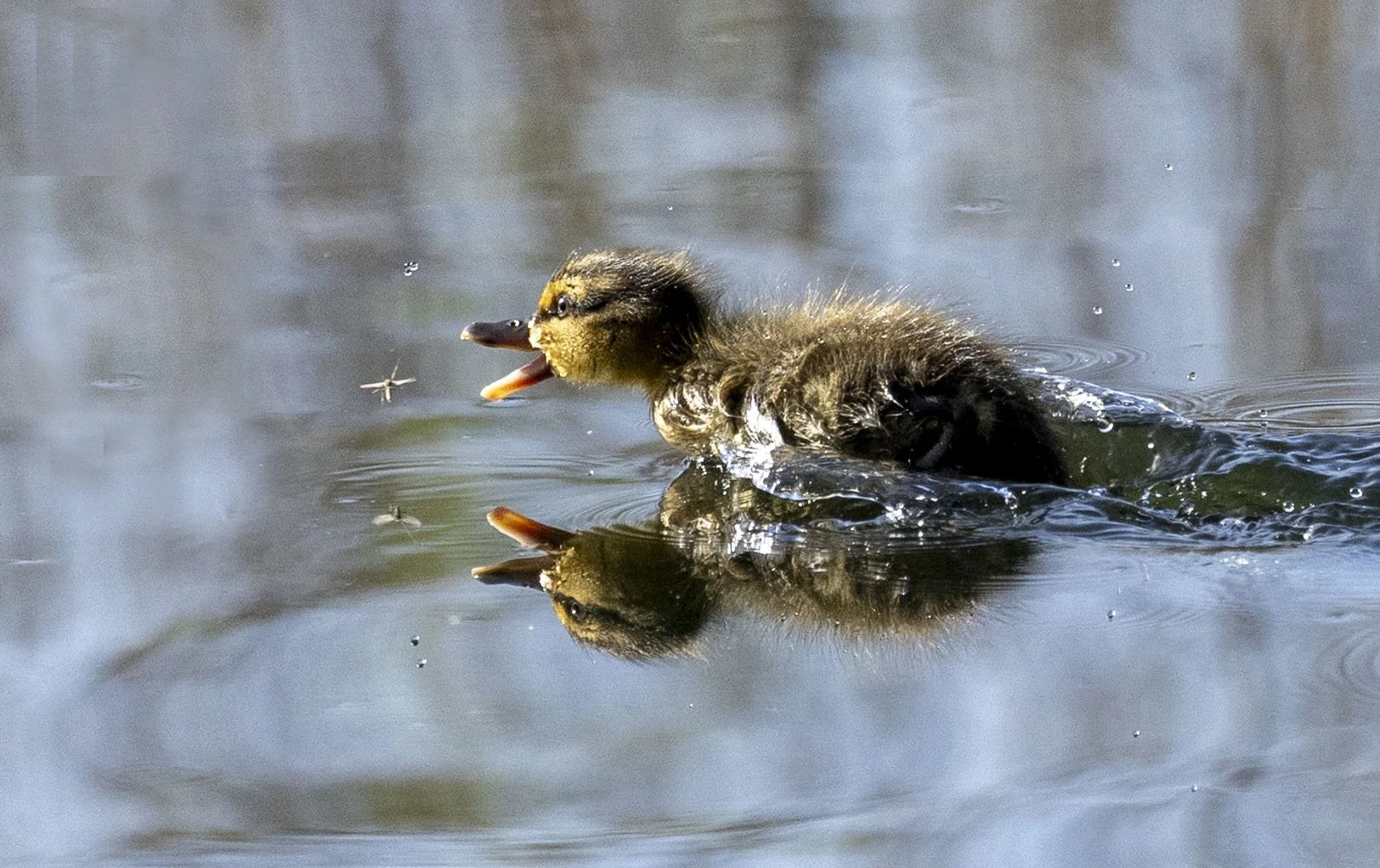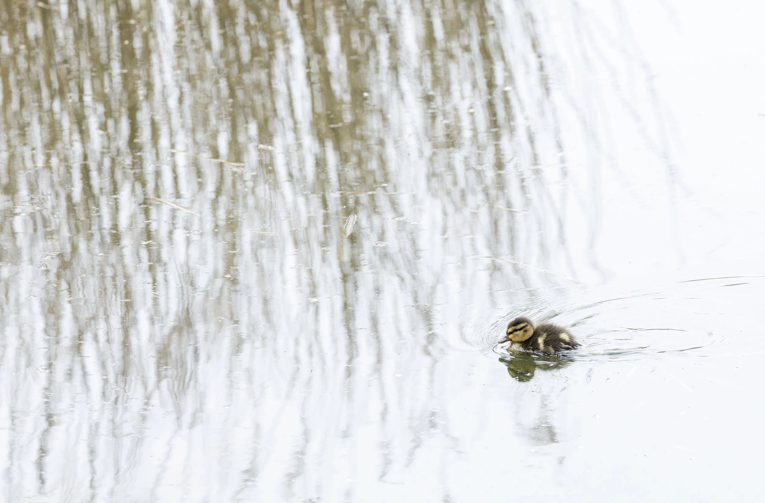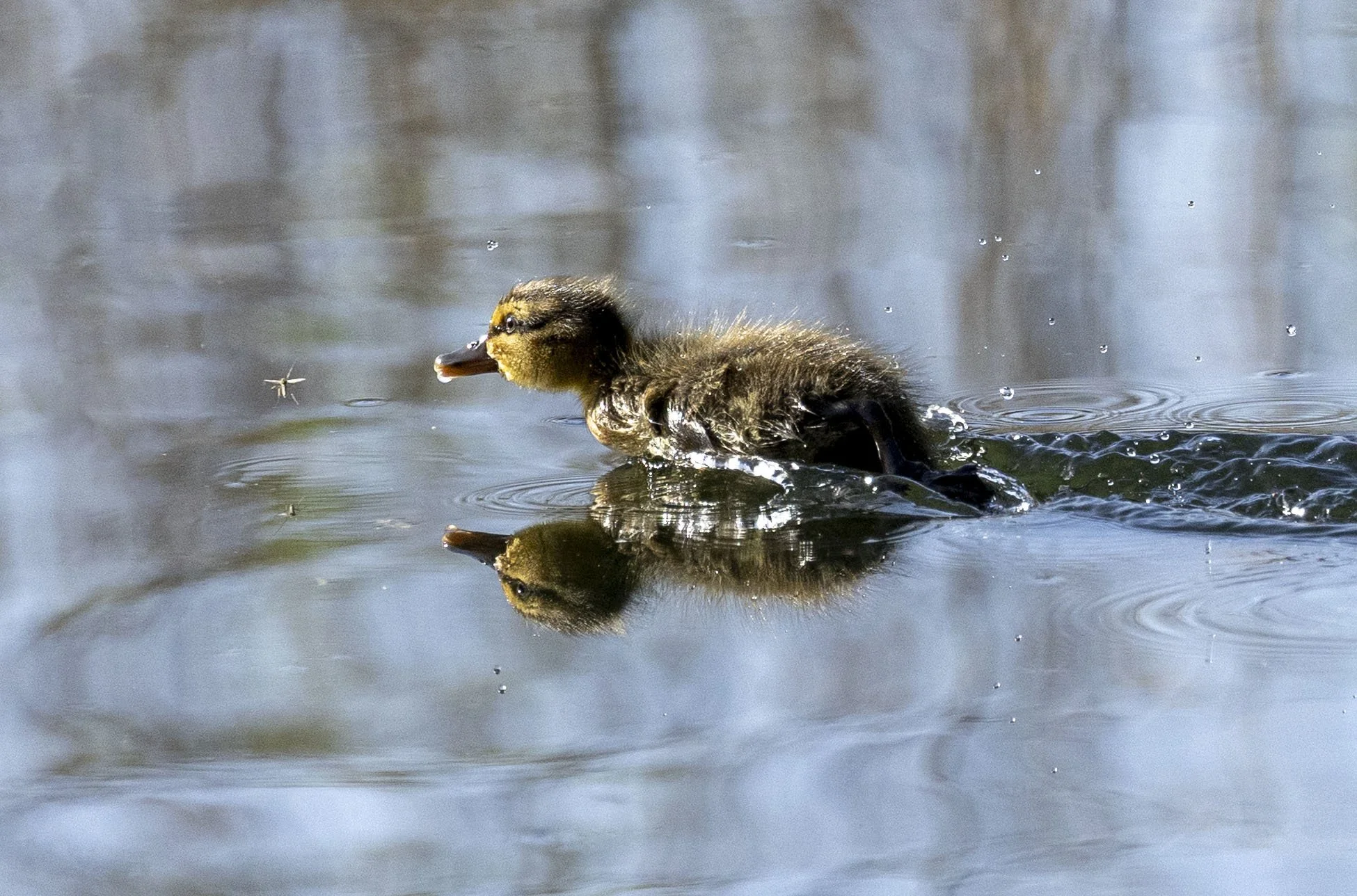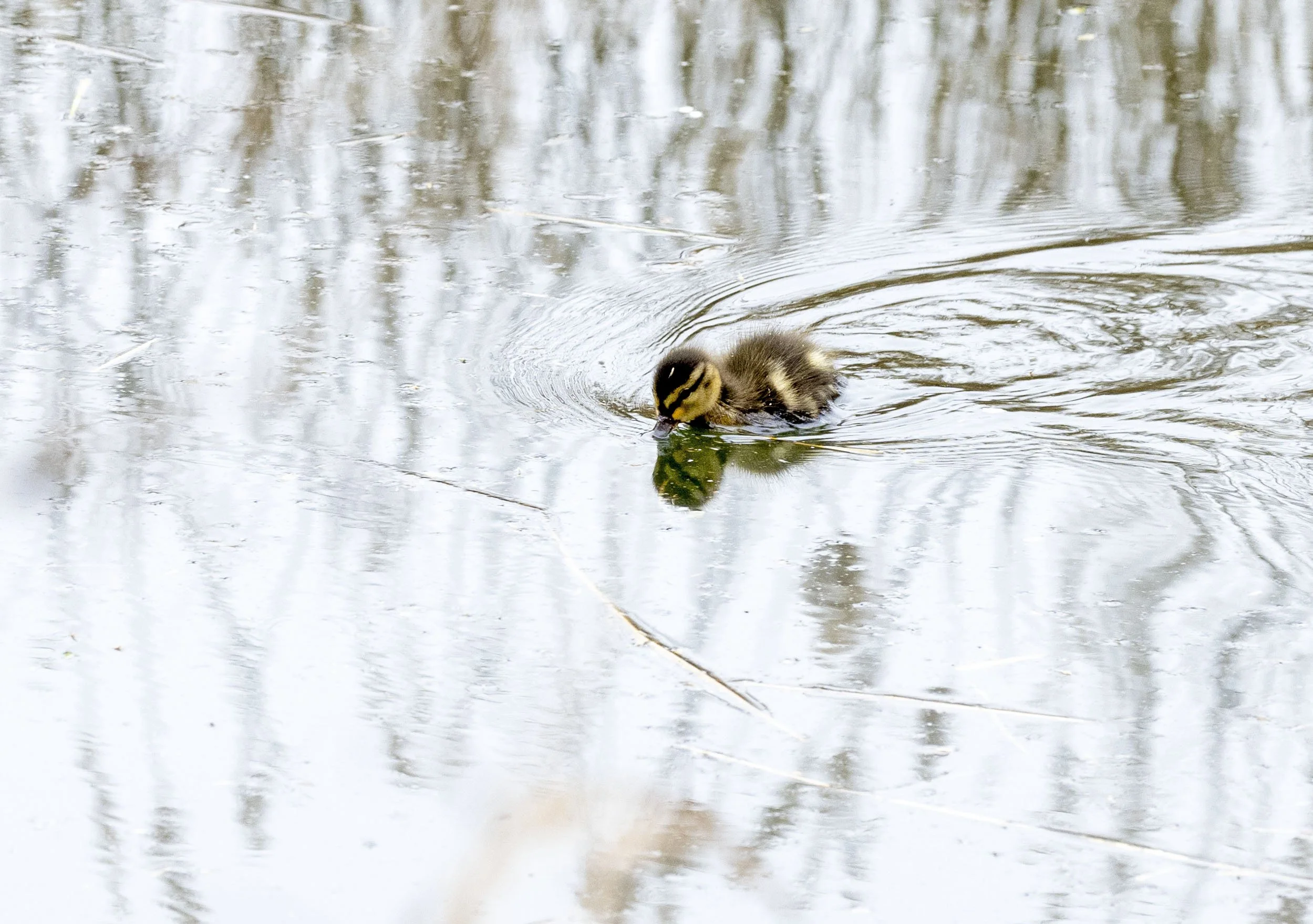 Mallard duckling in hot pursuit of a snack