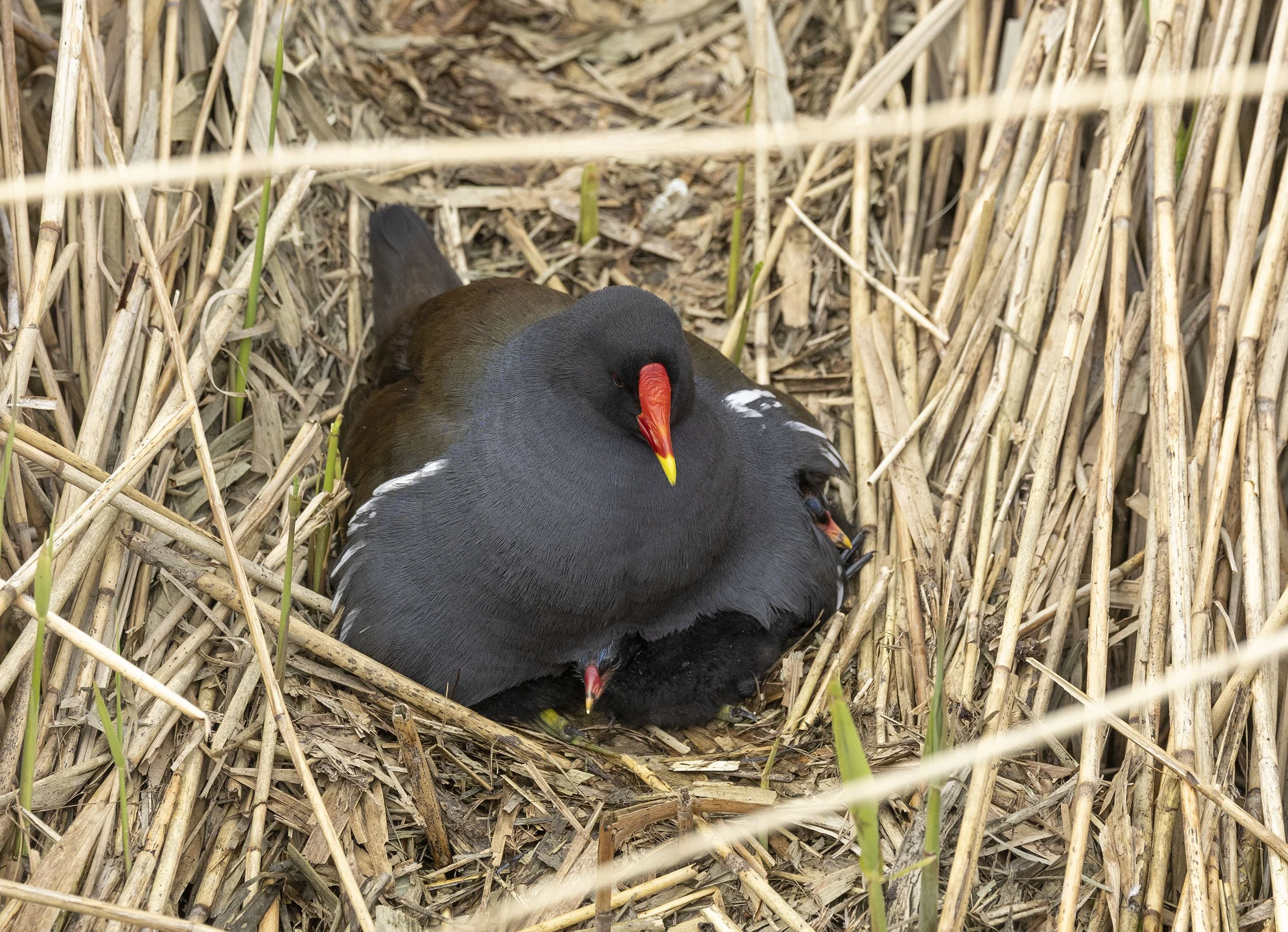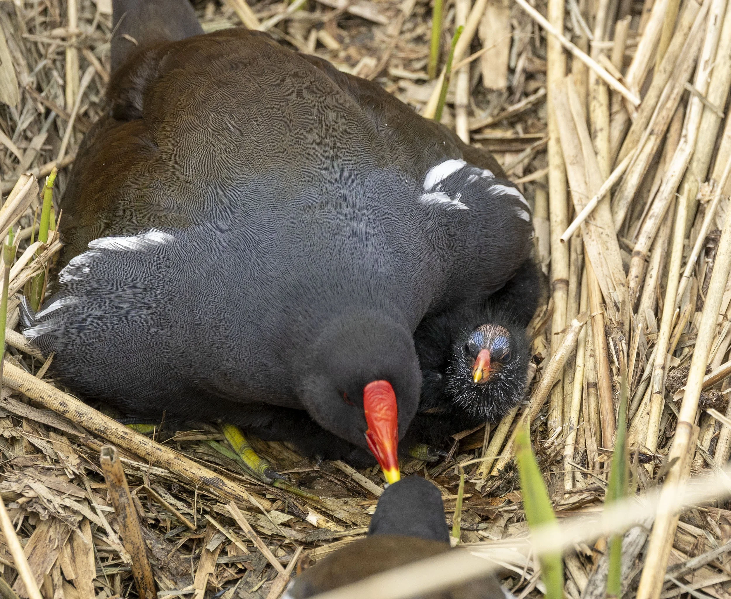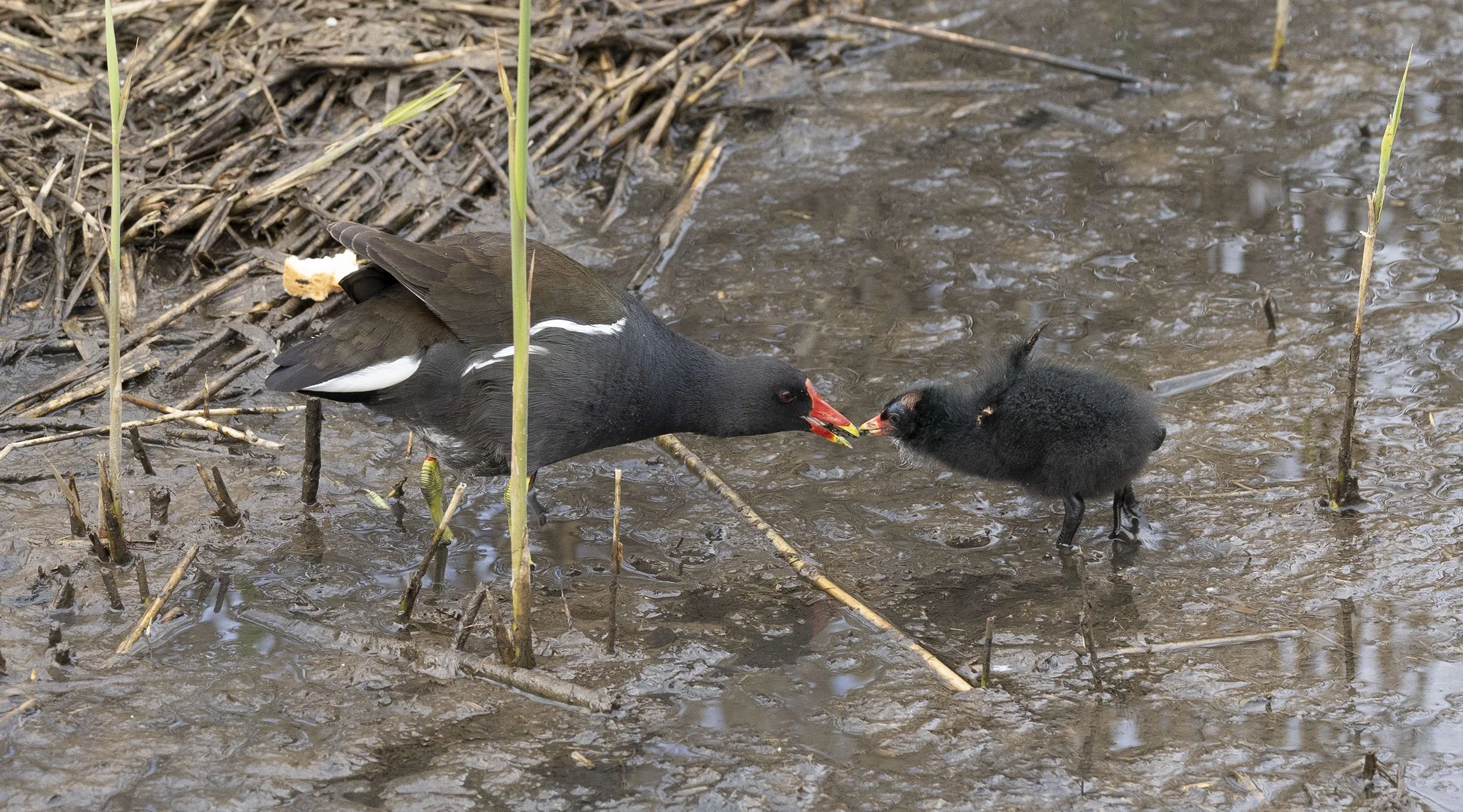 Moorhen male passing food to female to feed to the bizarre looking chicks