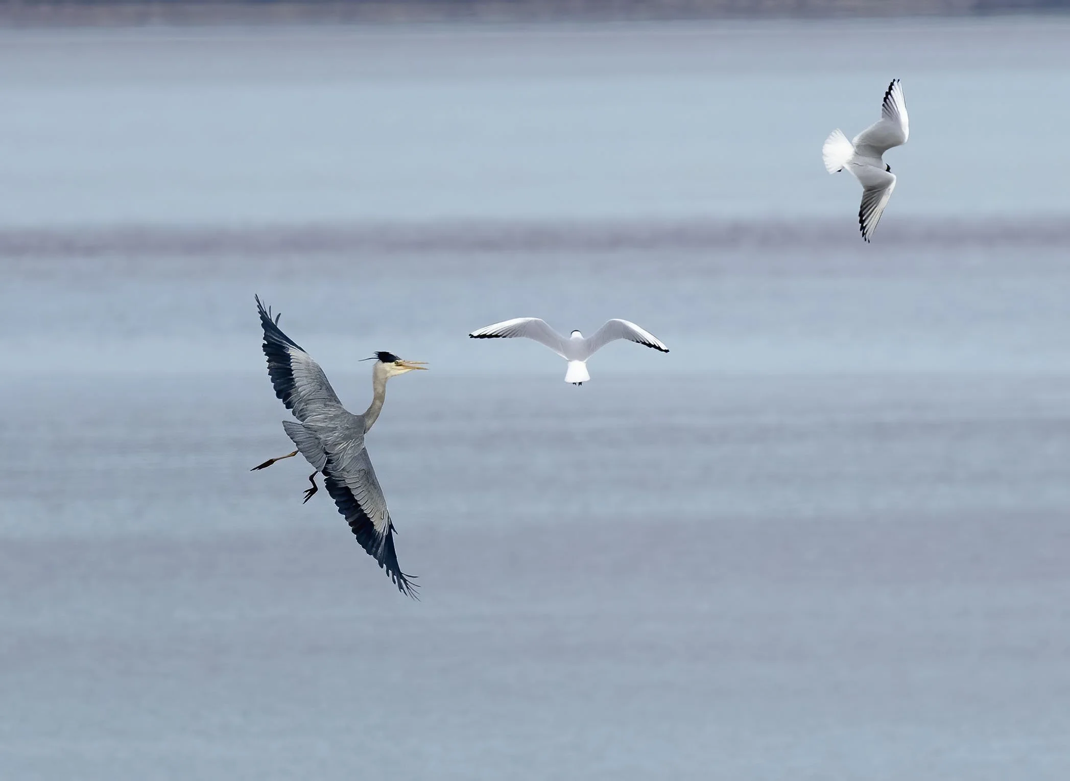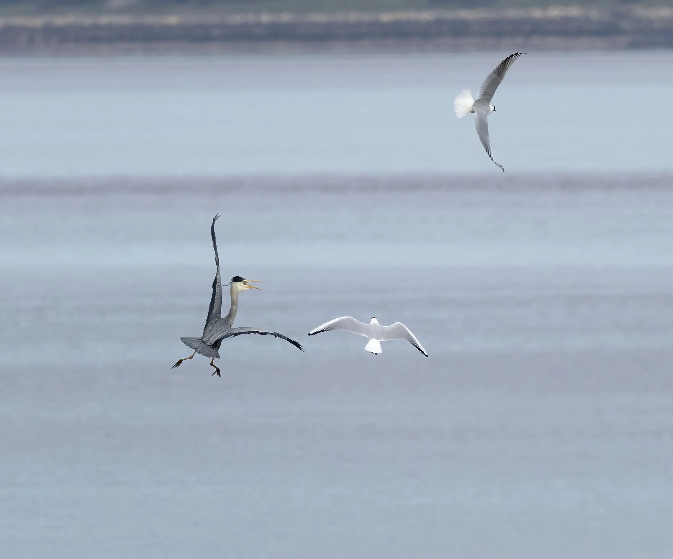 Grey Heron turning the tables on two annoying Black-headed Gulls