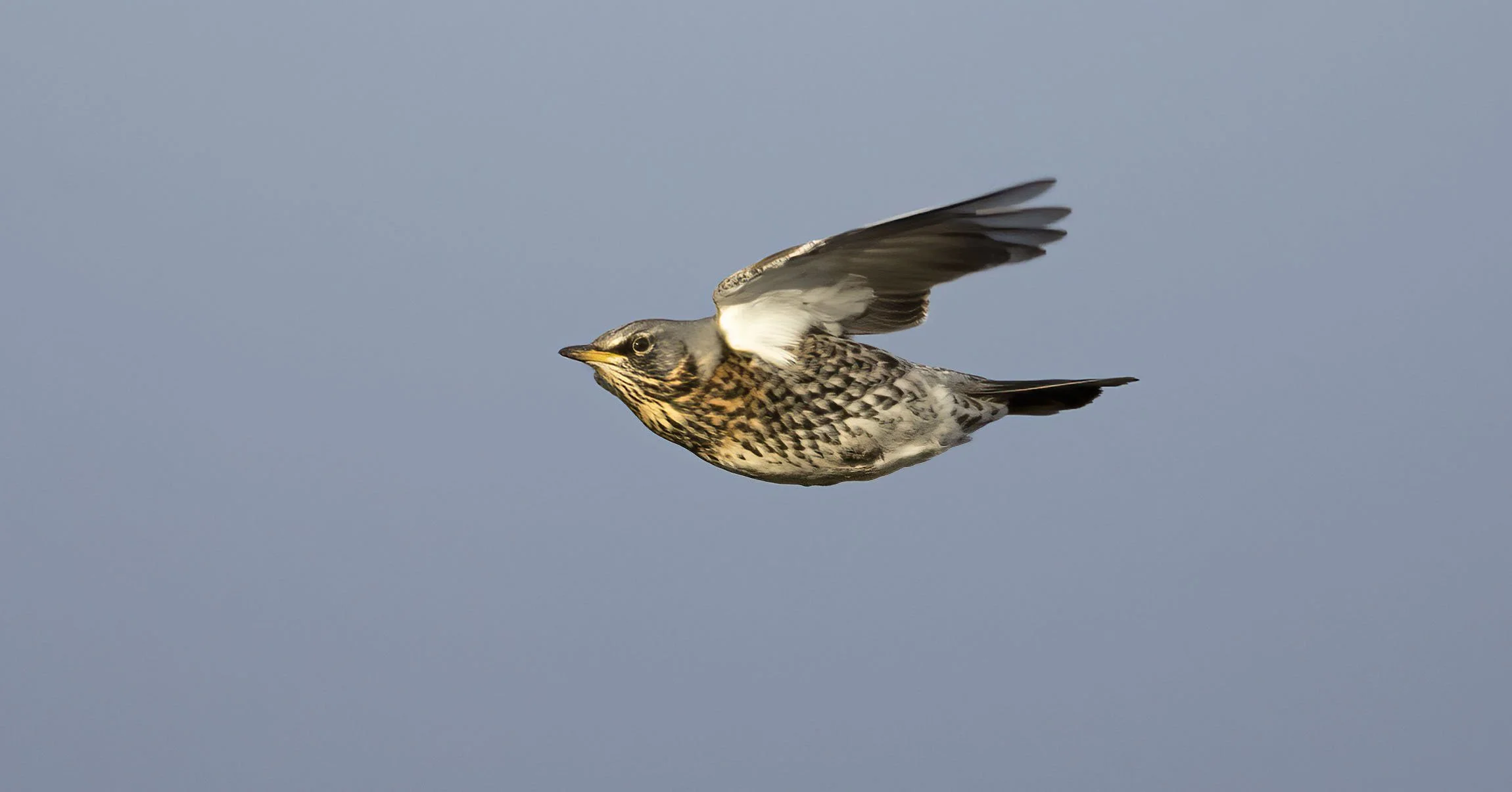 Underwing coverts tinged brownish and similar wash on underparts of first winter Northern Shrike in flight