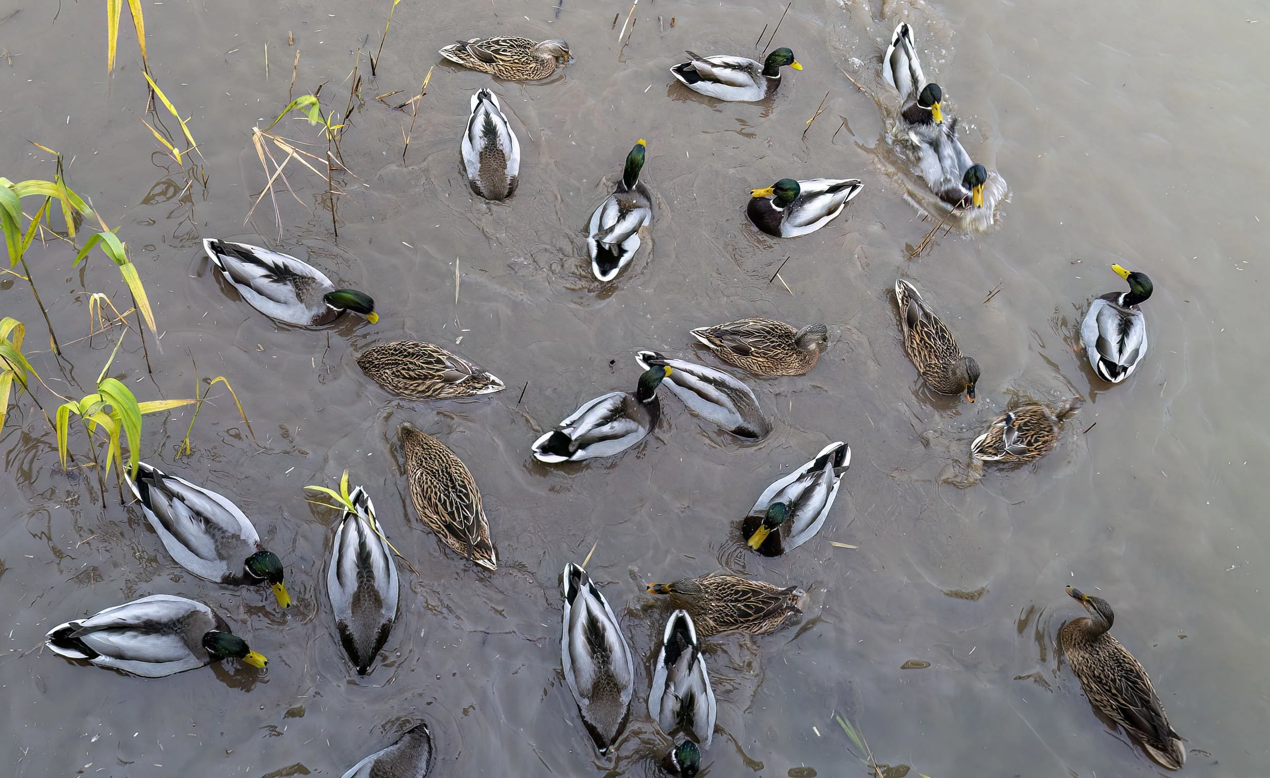 Bought a 28mm lens fr the arre landscape shots and skies but tried it out on the feeding Malalrd frenzy from above - ish