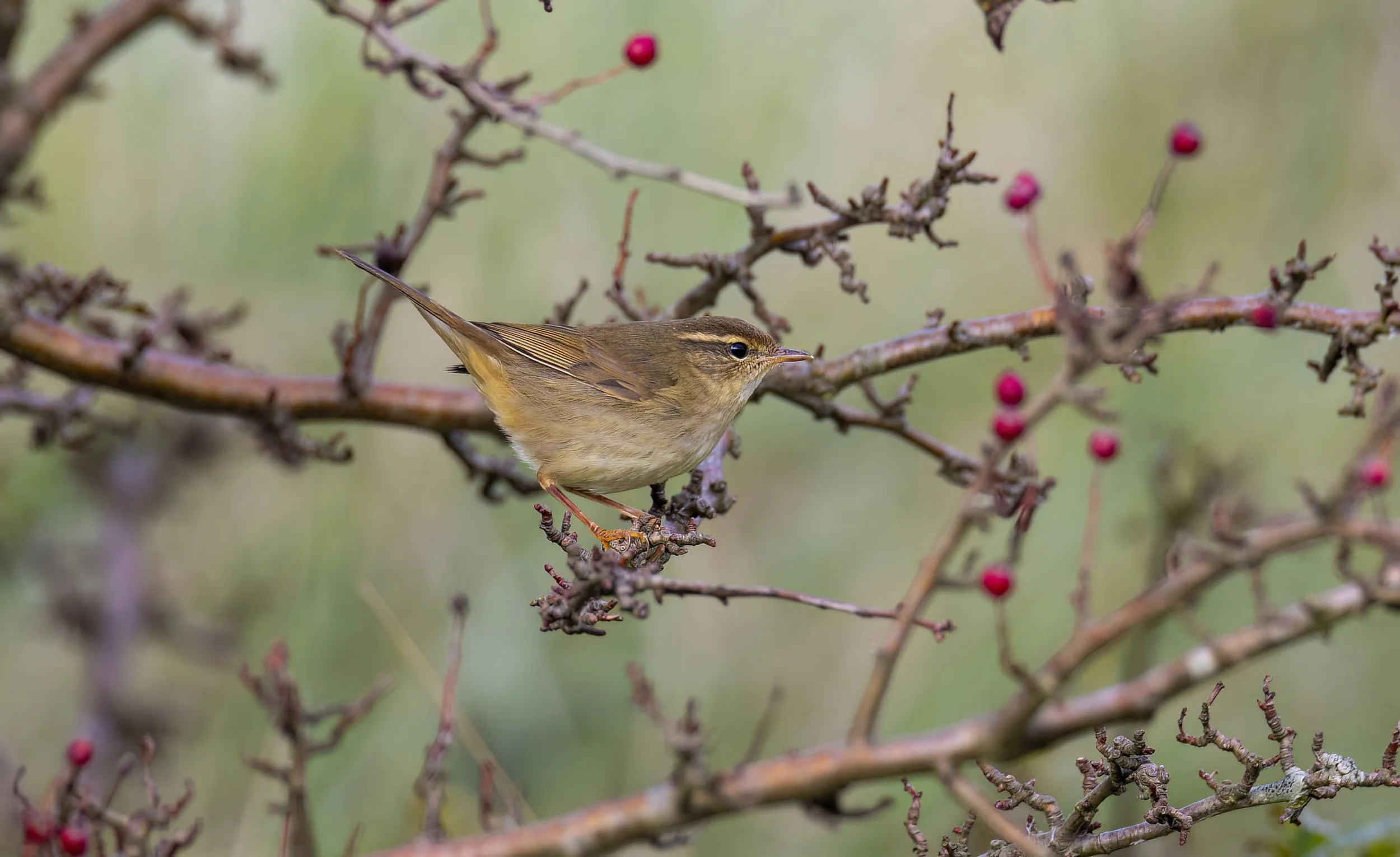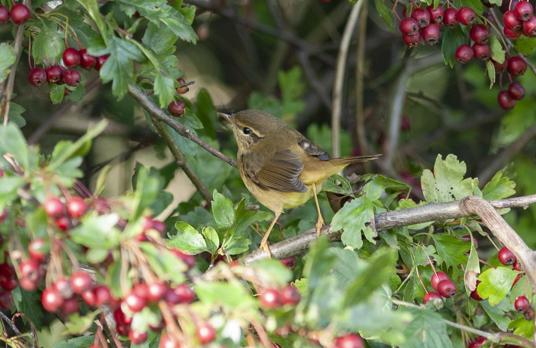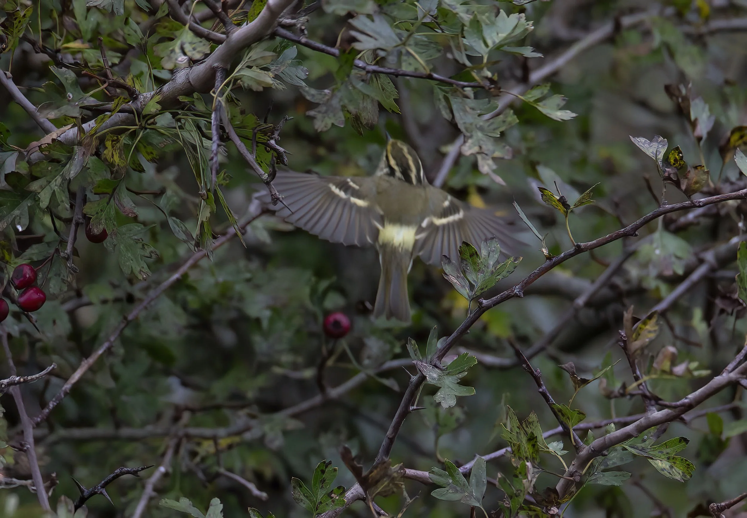 Views only with naked eye but at close range: flushed out of 4 foot high buckthorn mixed with bryony as I brushed past it – crawled out of the top of the buckthorn five feet in front of me and flew short distance before diving back into buckthorn; five minutes later while peering into a gap in the buckthorn it began to descend from the top of the buckthorn canopy showing its legs and undersides before disappearing again – about an hour later it was again seen briefly crawling away through the bottom of the buckthorn: very prominent long creamy white supercilia above a dark eye stripe – all upperparts a dark olive-green with more yellowish tinged rump – short rounded wings and longish broad tail in flight which was whirring – underparts yellow-ochre with orangy undertail coverts – legs seen when crawling out of buckthorn were strong, quite. Thick and yellowish. Crawled about in cover not flicking around like eg Chiffs;