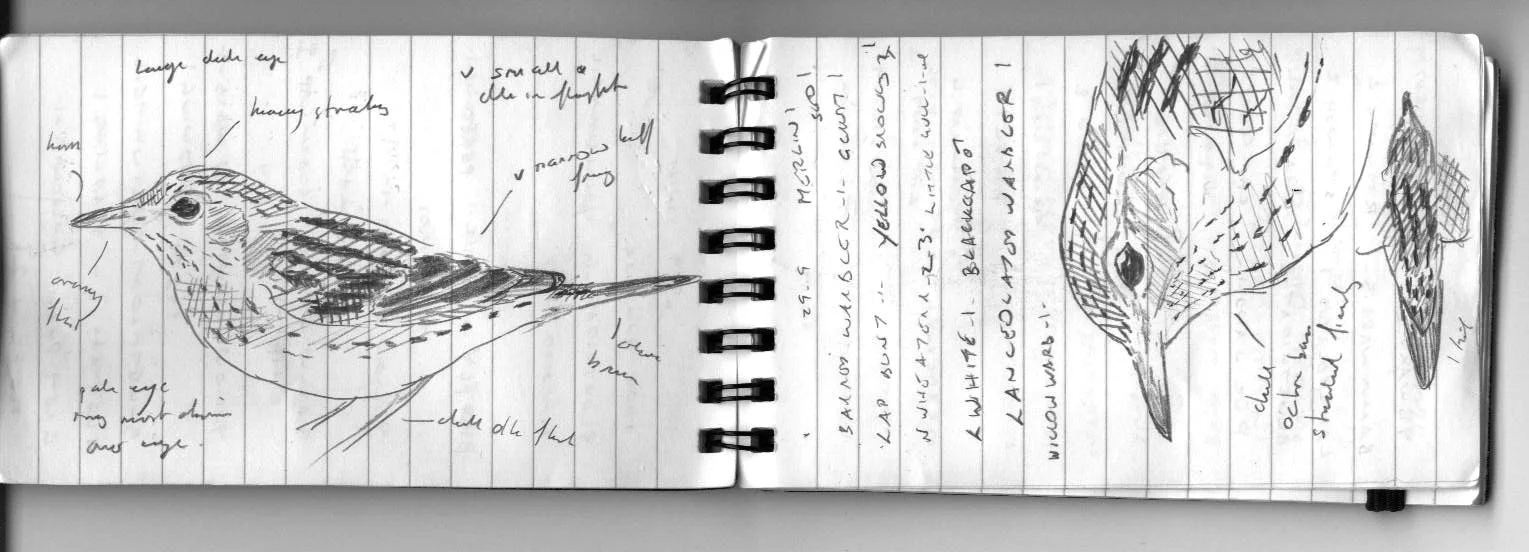 One of the advantages of working at Tring was access to the whole library of British Birds and I assiduously read and re-read and then photocopied all relevant identification articles and articles on finds of British firsts to fifths as these were then all published. The December 1972 paper Field identification of Dusky and Radde's Warblers R. J. Johns and D. I. M. Wallace with its exquisite pen and ink sketch by DIMW was duly at the forefront of my mind in that mid-October visit. On arrival we came across a small crowd, maybe 15 - 20 people looking for a Radde’s Warbler that had been seen on the side of the main path but it was elusive so we wandered off avoiding human contact even in those days but managed to connect with no less than four Yellow-browed Warblers and my first Great Grey Shrike of the autumn amongst an impressive fall. Wandering back past the Radde’s location the bird was being seen in flight crossing the path but we quickly realised it was feeding under a small clump of silver birch and a bit of combat stealth soon saw us sitting in the middle of the trees mixed with Willow herb and reeds, hidden from view; the Radde’s was totally unconcerned and fed within 10 feet of us chuck chucking away, negating the use of bins and the way to see a new bird. The following day we were at Cley with a Rough-legged Buzzard and Short-eared Owl arriving off the sea and 300 Twite accompanied by six Lapland Buntings and a strange bunting that we never did identify; Like a small Reed Bunting with heavy blackish streaking and white moustachial stripe but most noticeable was a white shoulder patch that was even visible in flight. We didn’t see the Dusky Warbler or the Black-throated Thrush that entertained later in the week but the return hitch to Tring went much more smoothly.