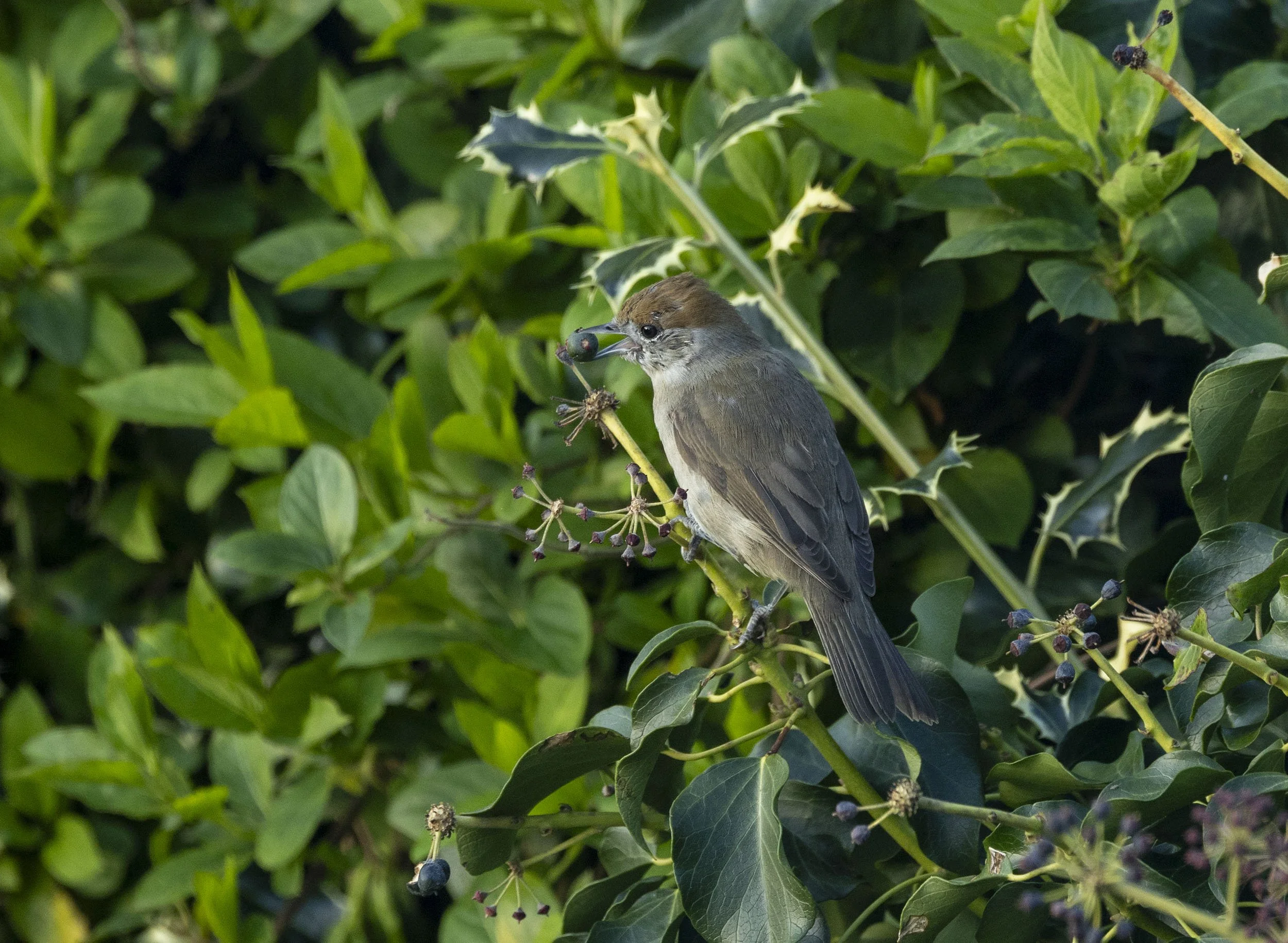 68 Blackcap - I saw what was presumably this female in a neighbours garden weeks ago but this week it came for a couple of our ivy berries - taken through the window - when I went outside after she moved off east I could hear a male singing a couple of gardens away which is what presumably attracted her - a wintering bird meeting a spring arrival