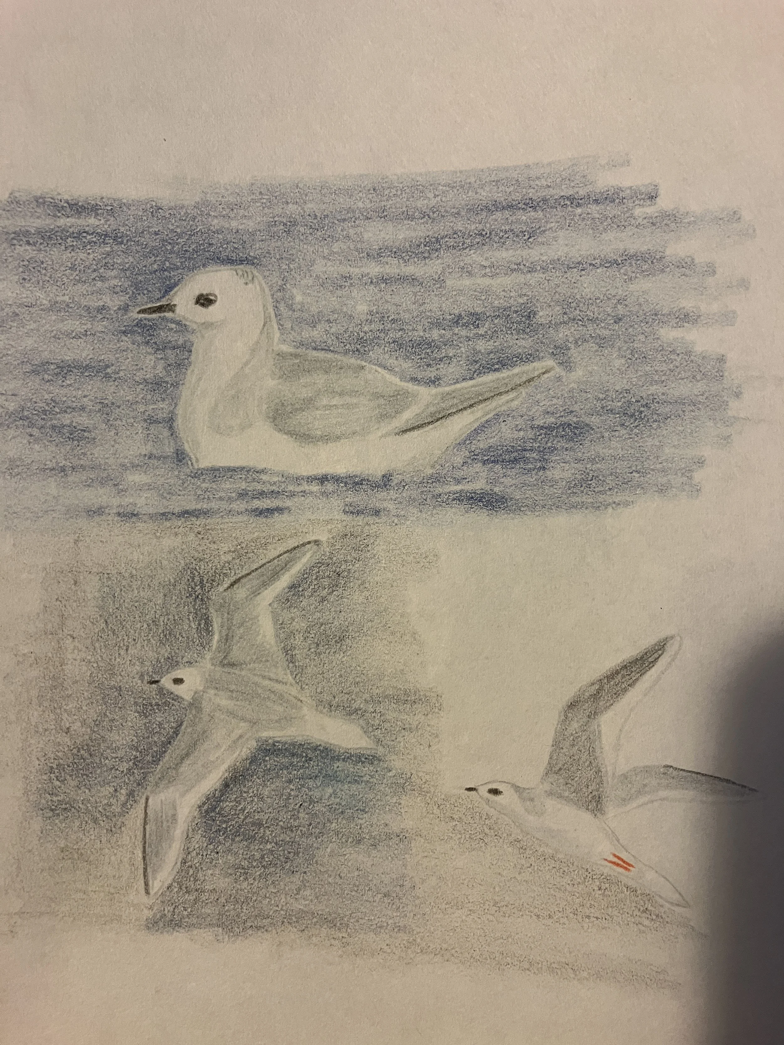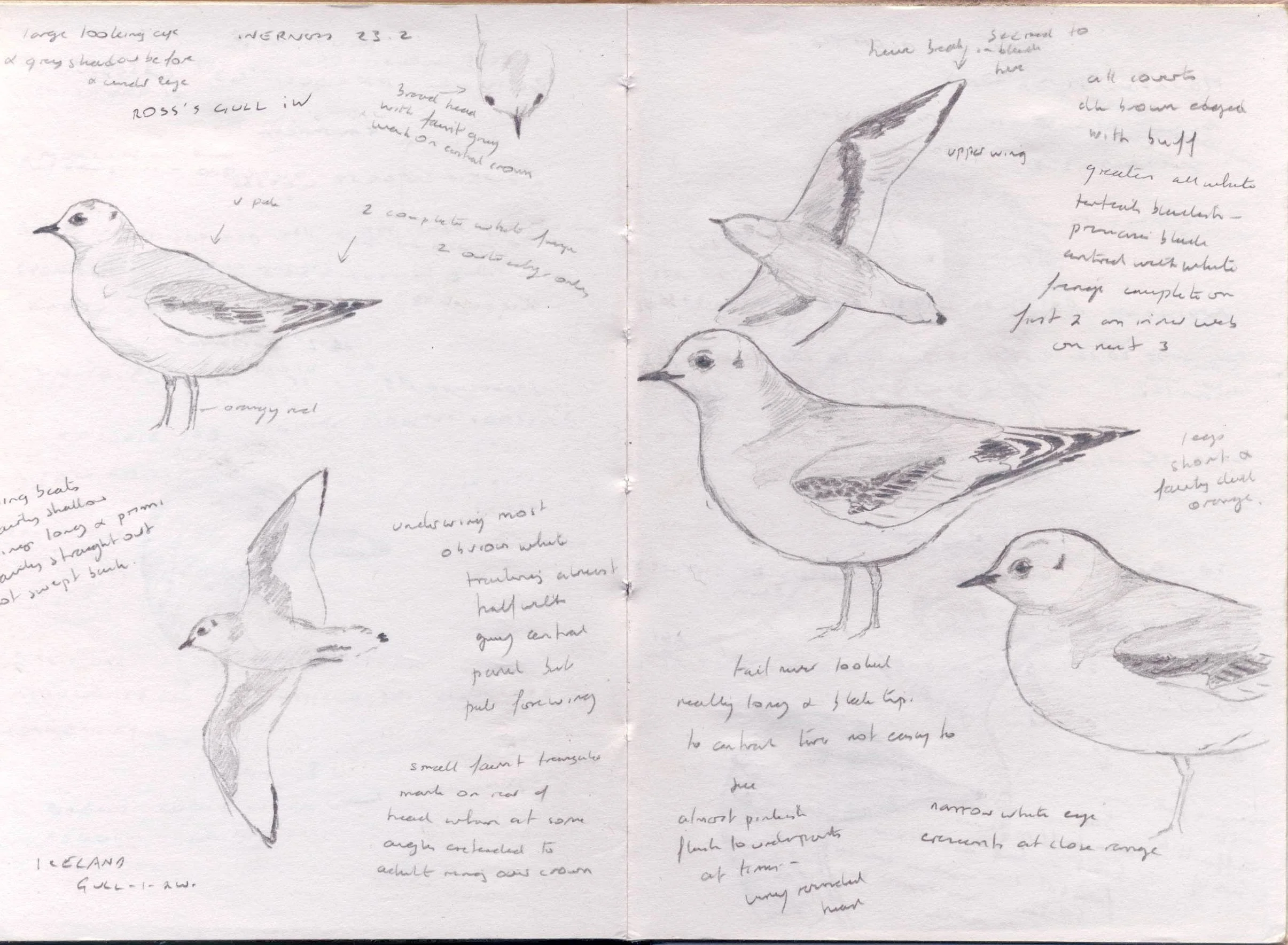 With two adult Ross’s Gulls seen I stil wanted to see a first-winter and in February 1993 one was being reported at an outfall on the River Ness at Inverness. This was too good an opportunity to miss and it was back onto the East coast main line and a train trip north which I worked out would get me to Inverness hopefully in time to see the bird that afternoon. The train was on time and after a wander through the docks I found the outfall and the bird. a real stunner. Again no camera but I enjoyed sketching it and was back home the following day at zero cost.