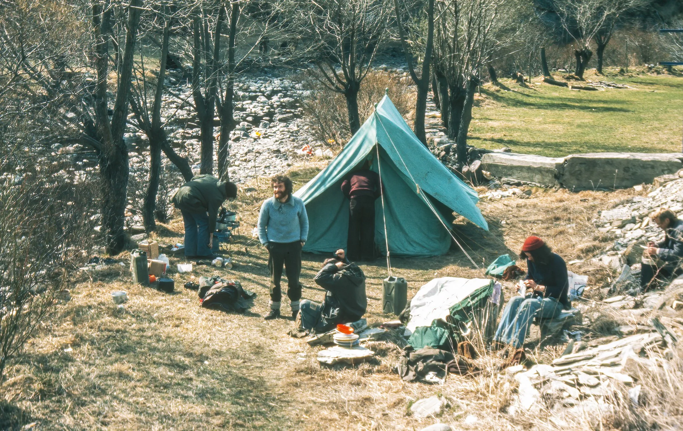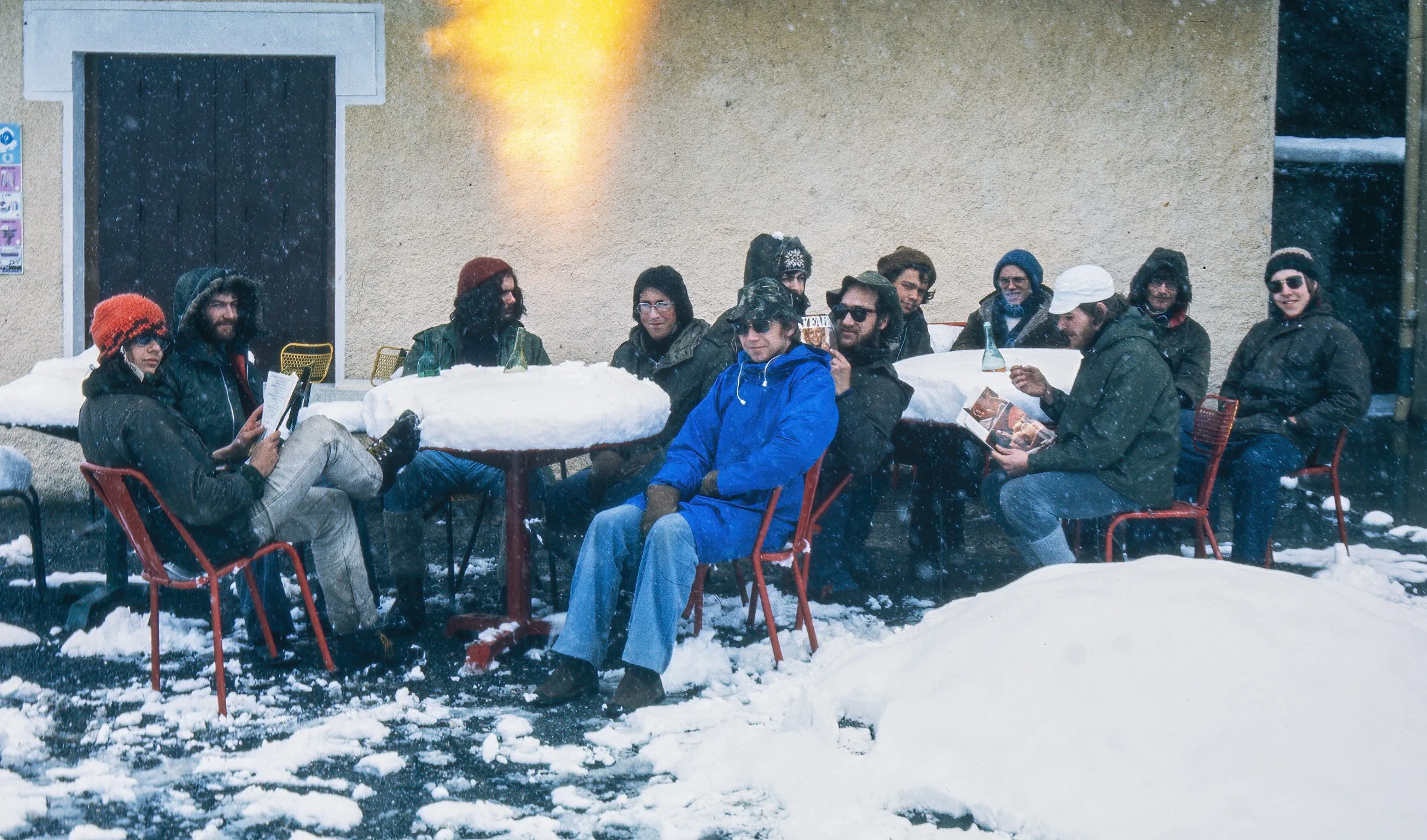 We awoke in our tent at Gavarnie in the French Pyrenees toa dump of 8 inches of overnight snow - some of the team not exactly prepared for sub-zero temperatures - note the tell tale Zenit B camera orange glare as the back of the camera often came open of its own accord affecting the precious slide film.