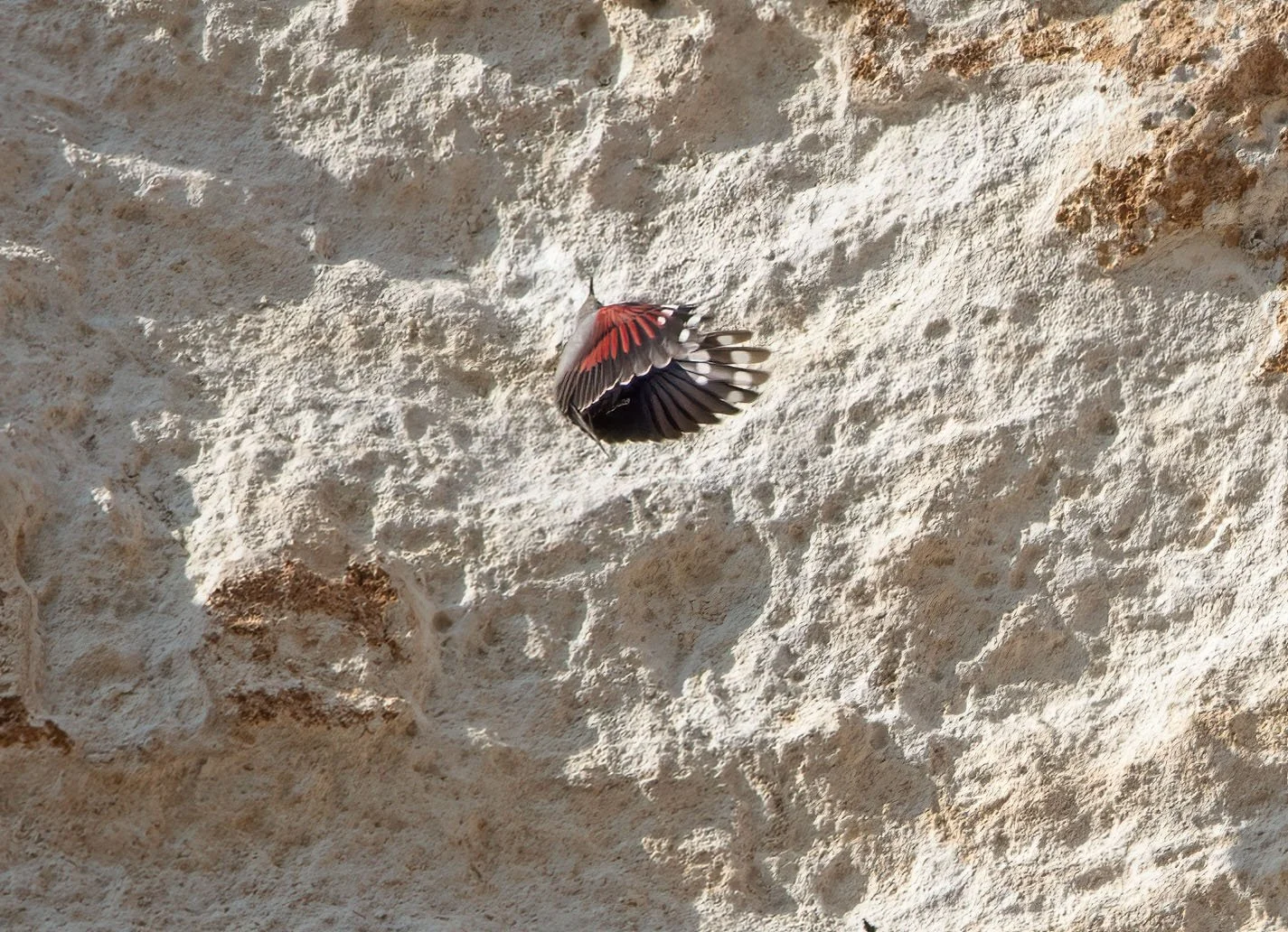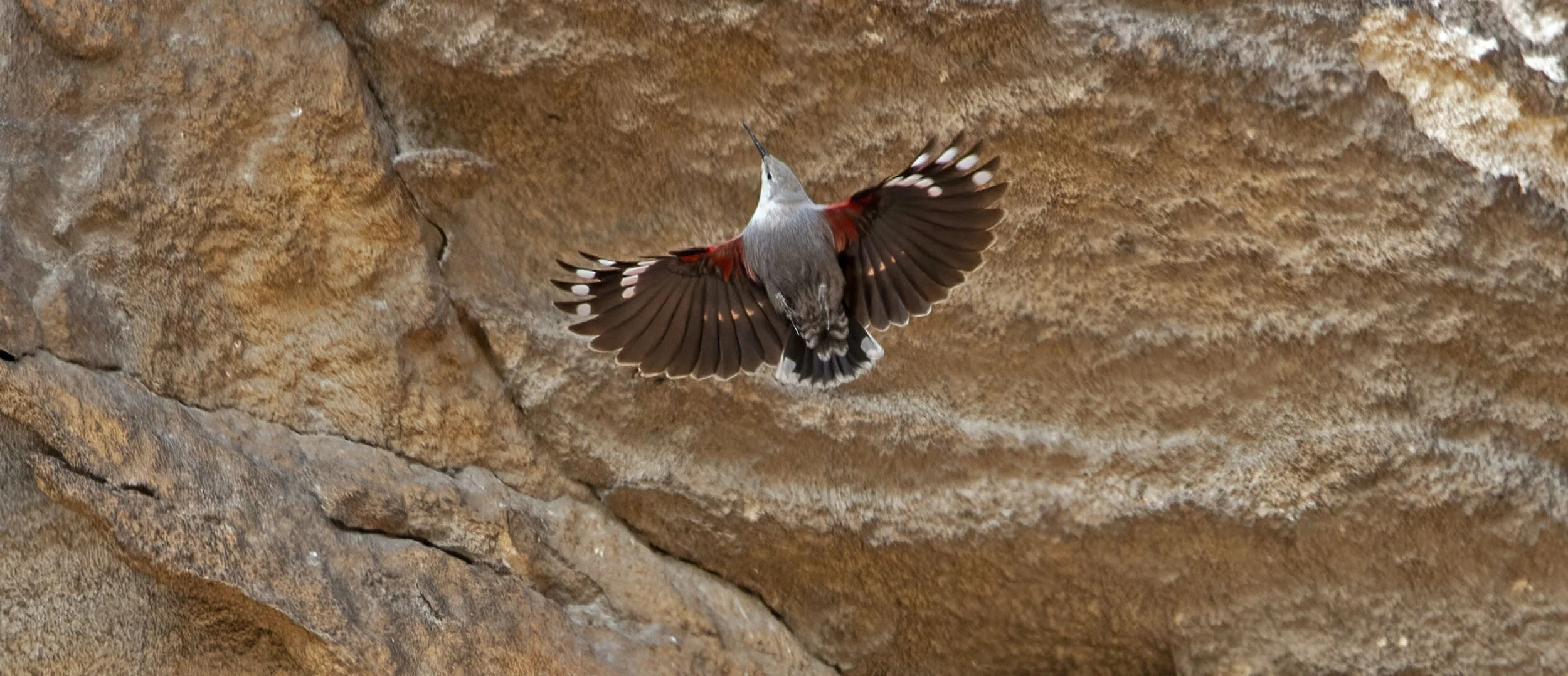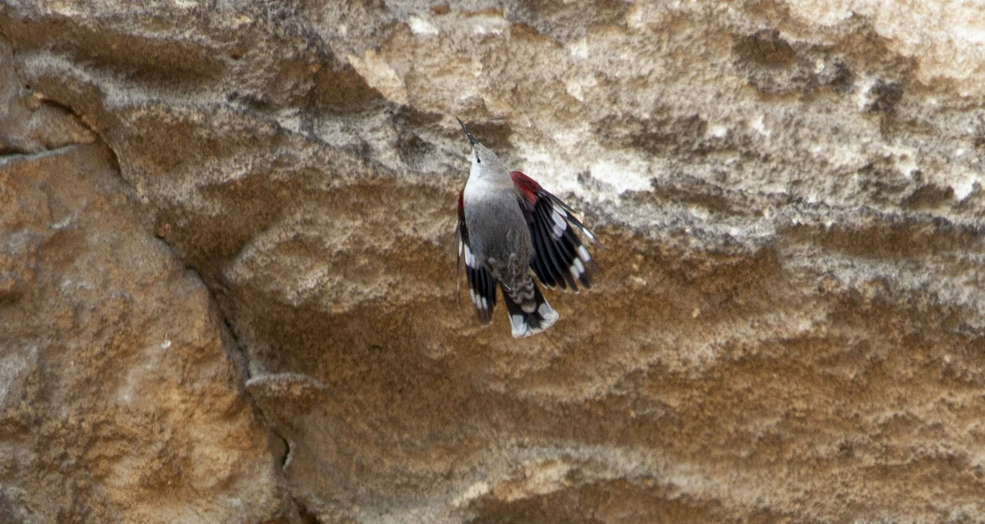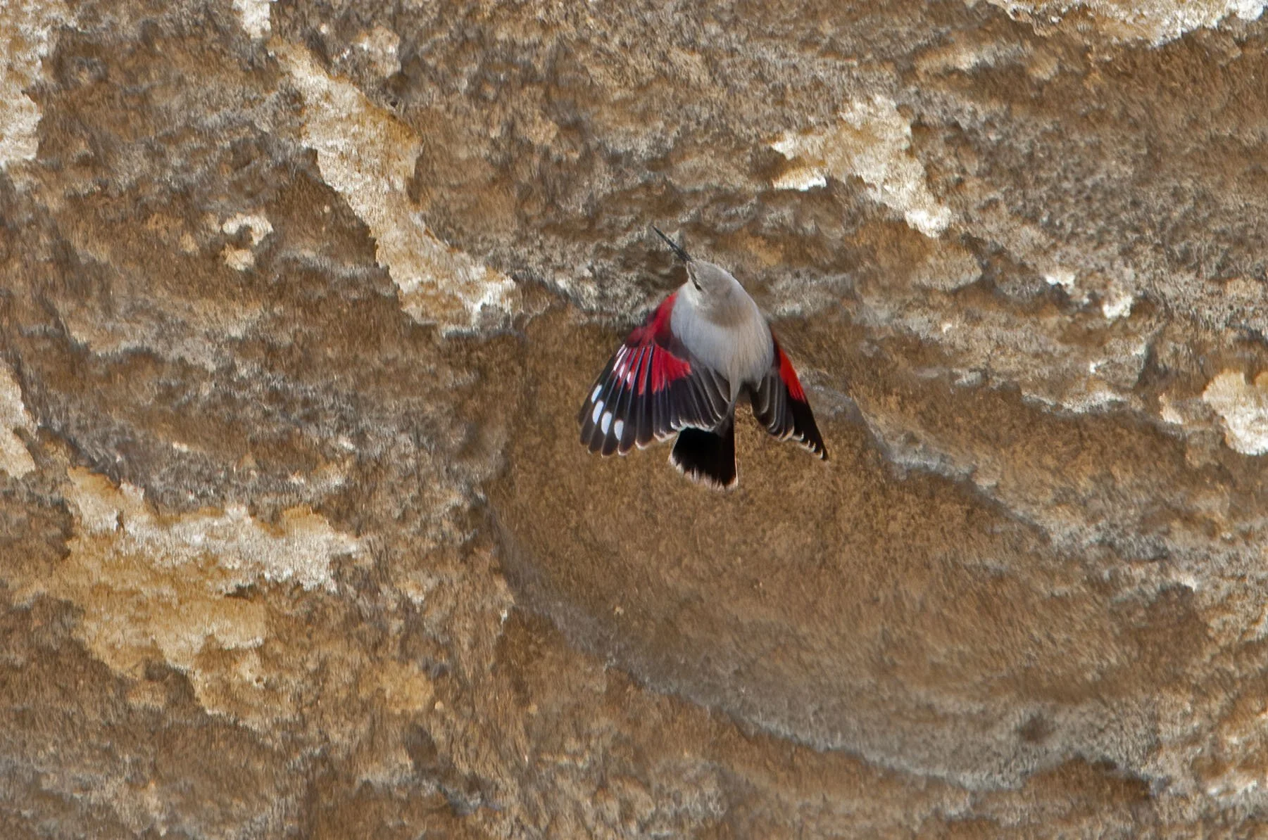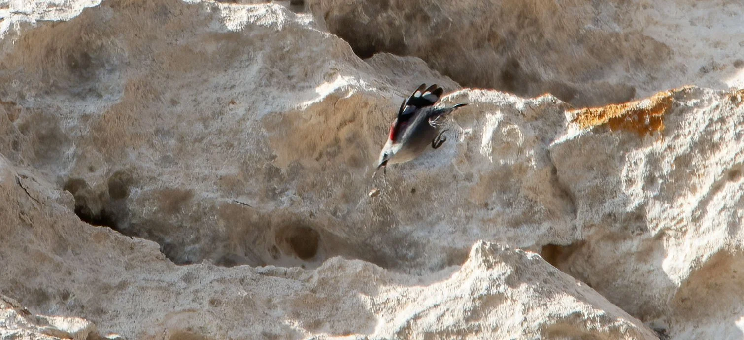 It would regularly fly up to a hole or crevice in the cliff face and disturb something that would then eitehr jump or drop from the cliff at which point the Wallcreeper would fly down and catch the prey item in the air - amazing to watch but impossible to capture in the camera auto-focus systems of 2010 - today’s gear should provide a better chance