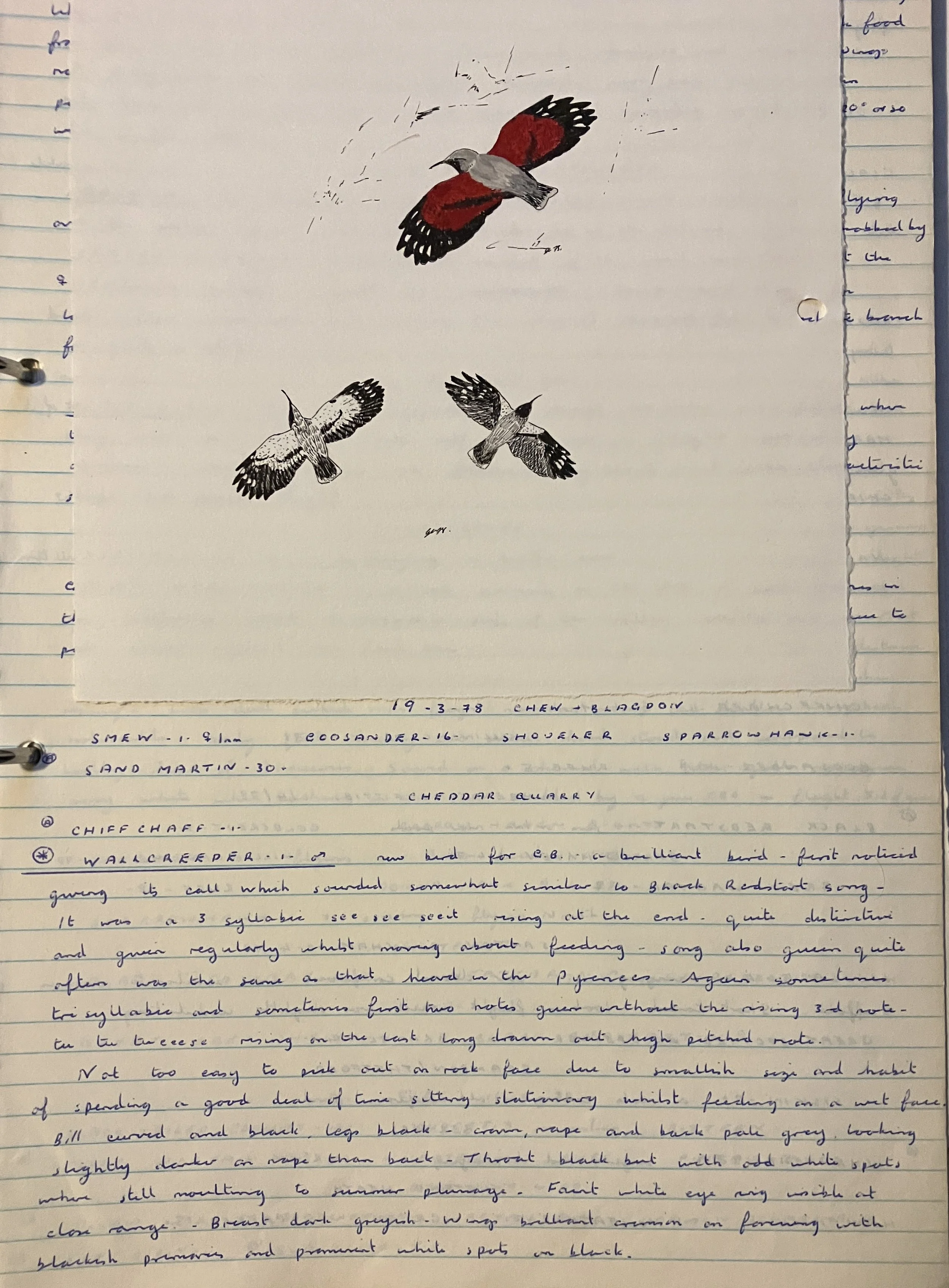 Unbeknown to 99% of UK birdwatchers a Wallcreeper had wintered in the Cheddar Gorge area of Somerset from early November 1976 to April 6th 1977. The first since the widely available Winspit bird in 1969 – 1970 it would have drawn a big crowd but was not made public. Fortunately, it returned on November 9th 1977 and stayed through to April 8th 1978 with news being released to all and sundry in March 1978. Mick Mellor and myself decided on a visit on March 19th and after negotiating the quarry wall and ending up in the bottom we had some great views as detailed blow: it remains the only bird I have seen in Britain and a wintering individual now would be a massive draw as the last British record was a one day bird on the Isle of White in 1985.