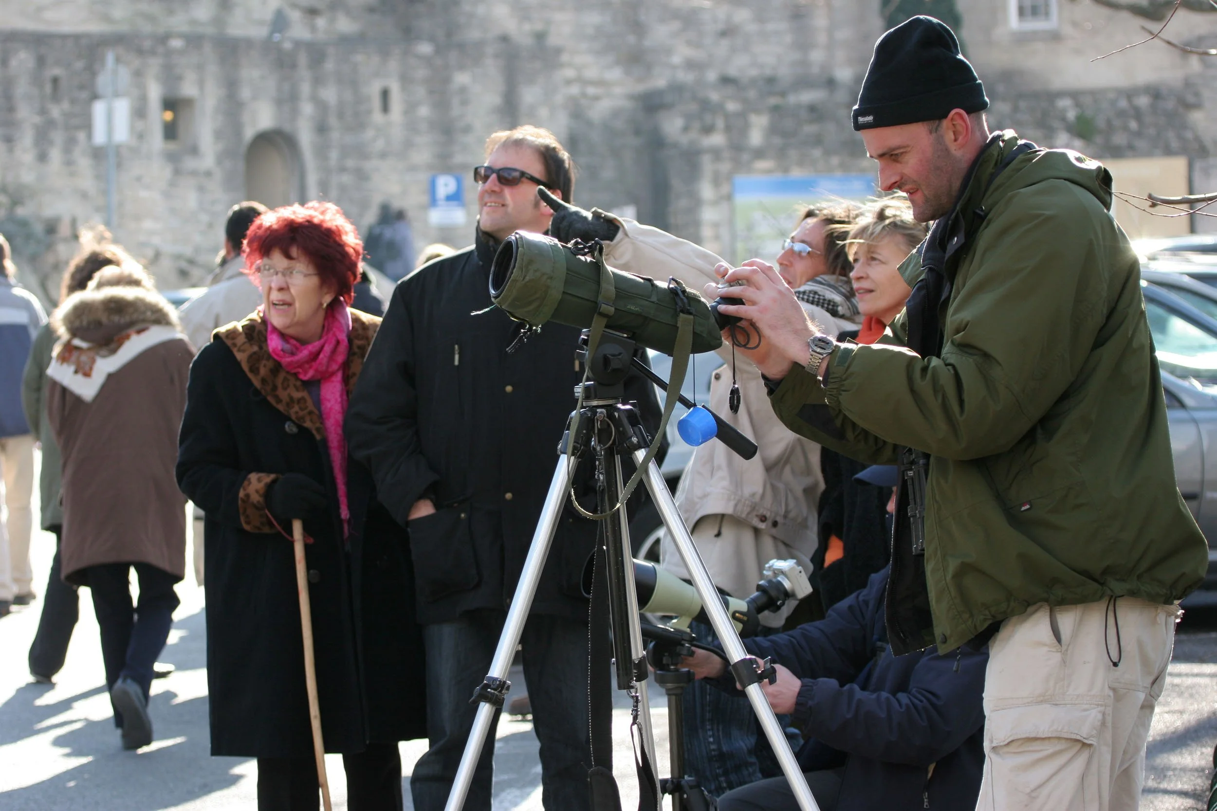 local tourists taking in the Alpine Accentor by the entrance to Les Baux courtesy of digi-scoping KDD and DJJ
