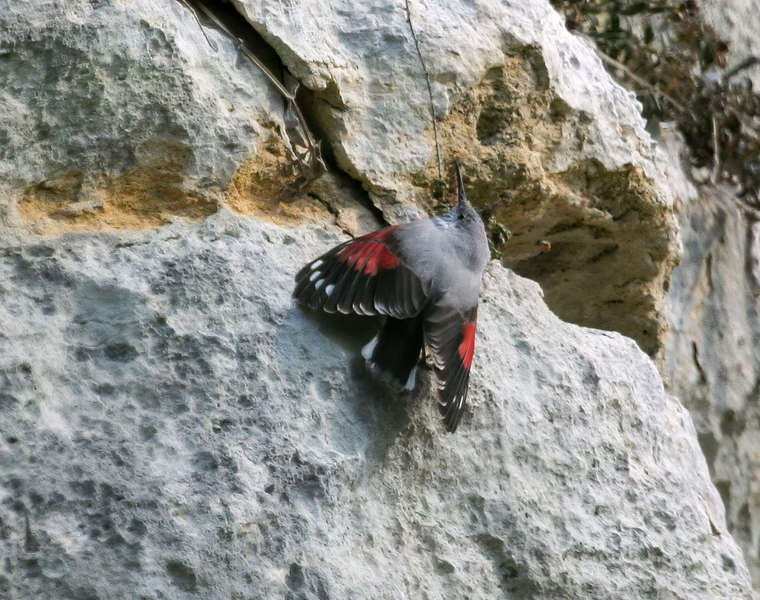 flying up to the cliff face to probe for food in a hole