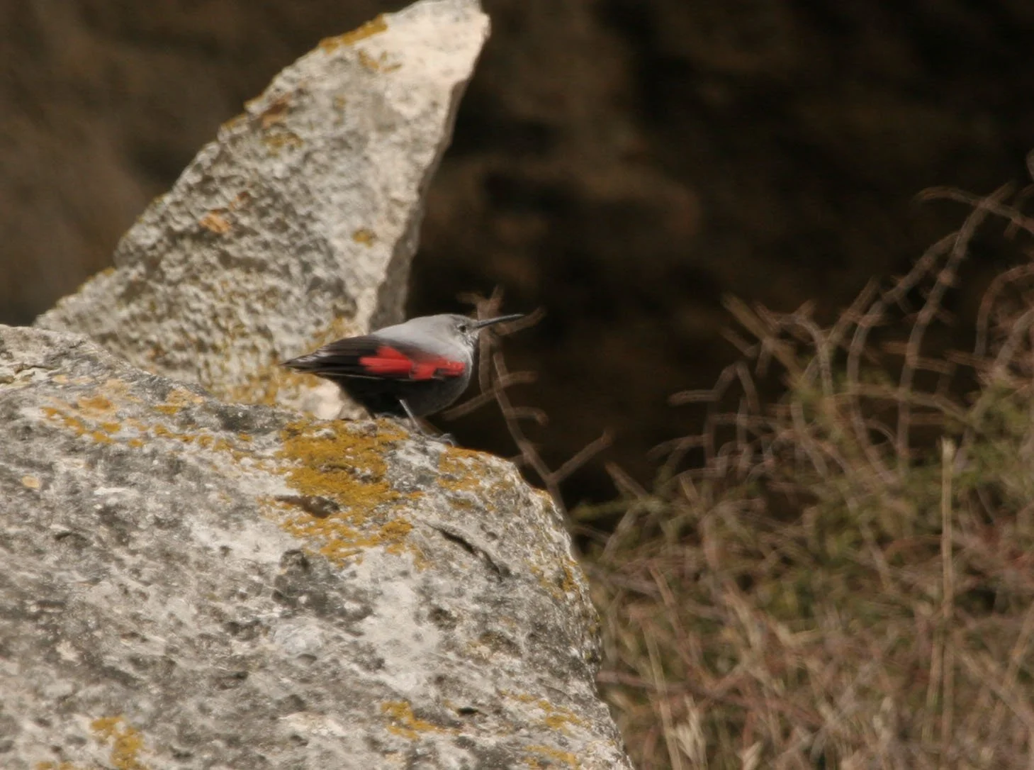 my first Wallcreeper image taken at shall we say a slow shutter speed in the depths of the gorge in flight - almost recognisable