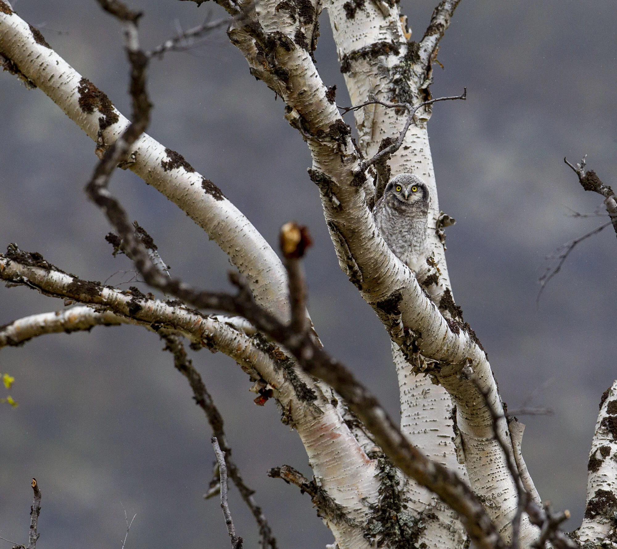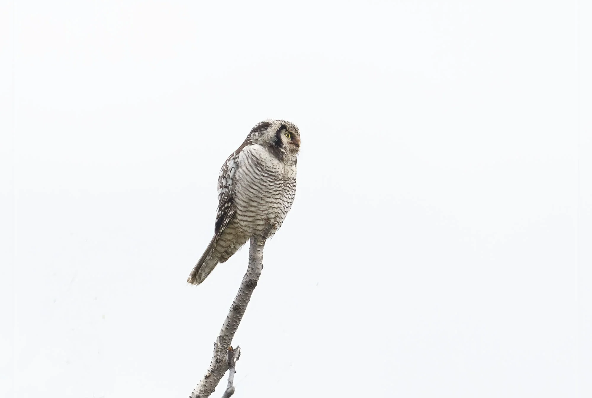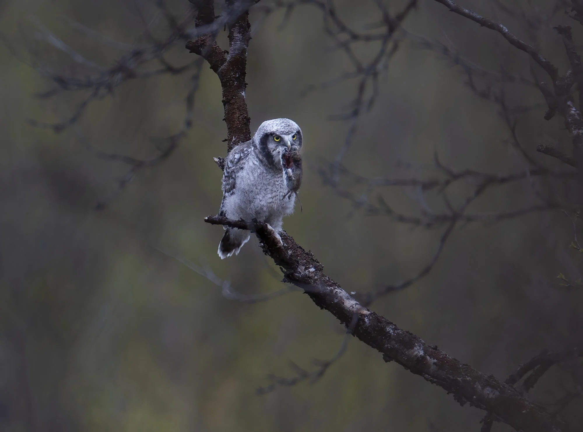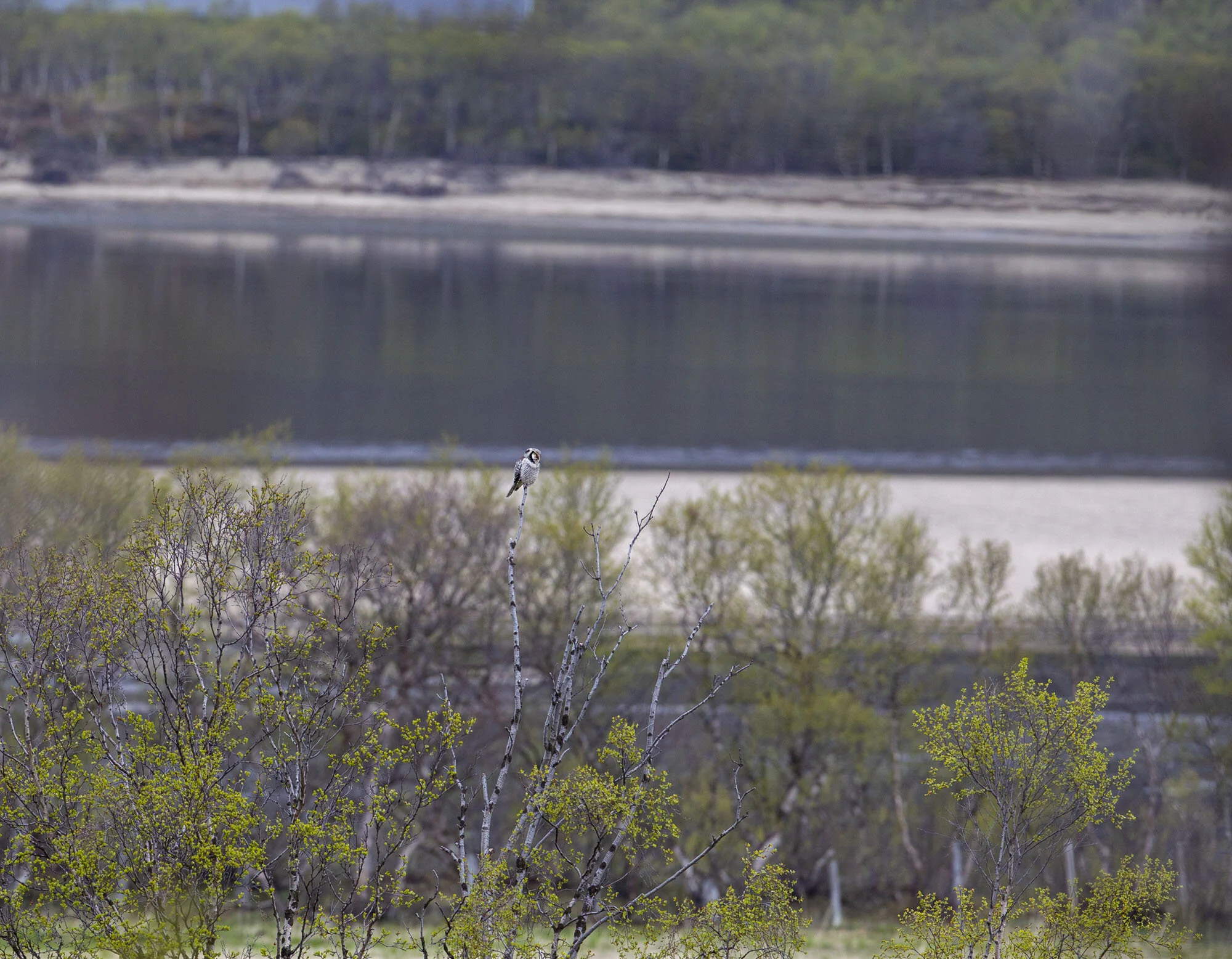 During a trip to Varanger in June 2012 we were fortunate to find there had been a bumper breeding season for Hawk Owls in the area with excellent vole numbers. In the course of the week in the area we came across six pairs with young most of which were out of the nest already but one nest at higher elevations on the road up towards the Batsfjord tundra still had young in the nest. The main problem for photography was that the weather was a bit dismal most of the time with a lot of thick cloud and some rain while the adults were often liberally blood splattered around the facial disk! Below is a selection of images from the week.