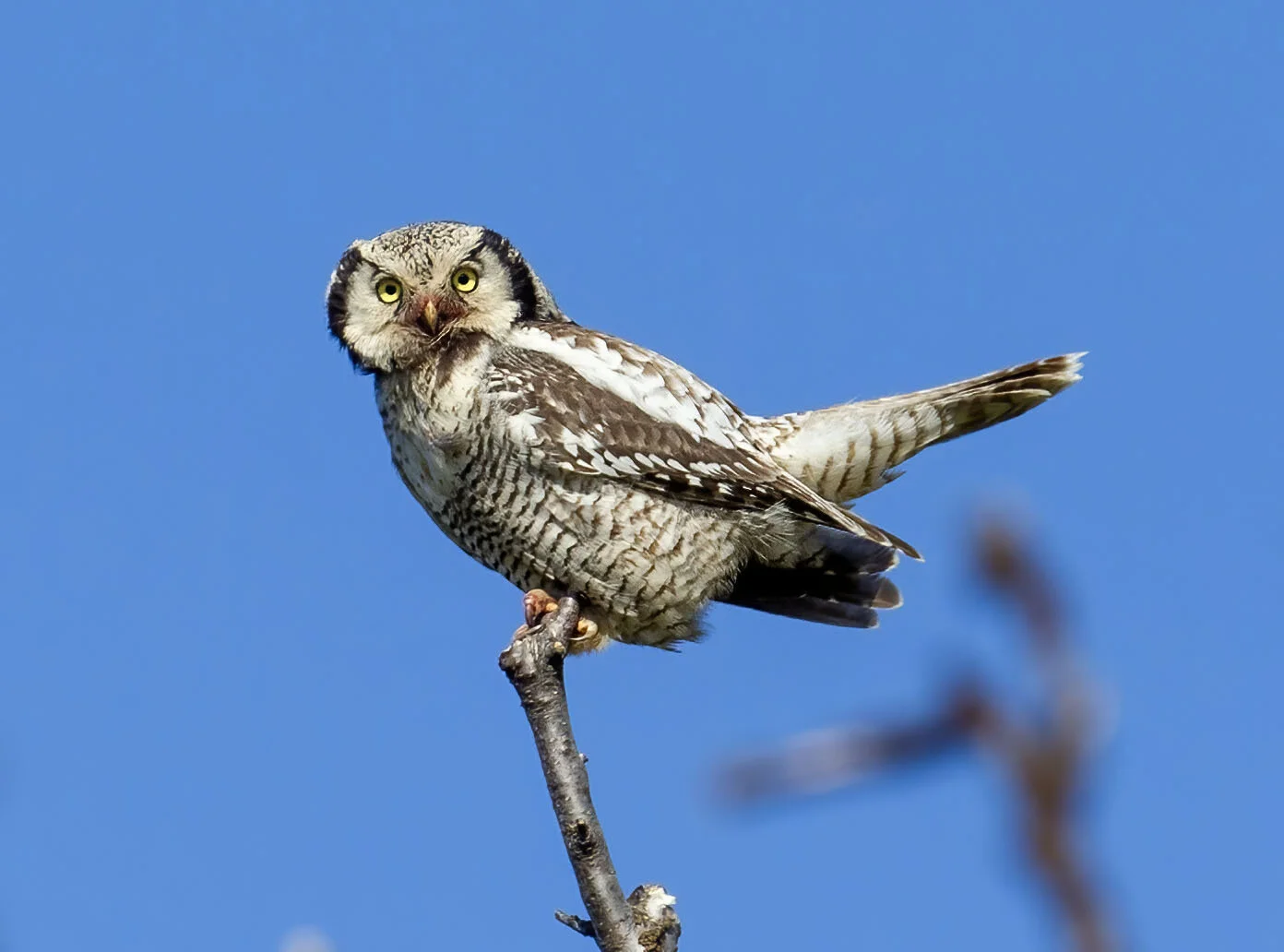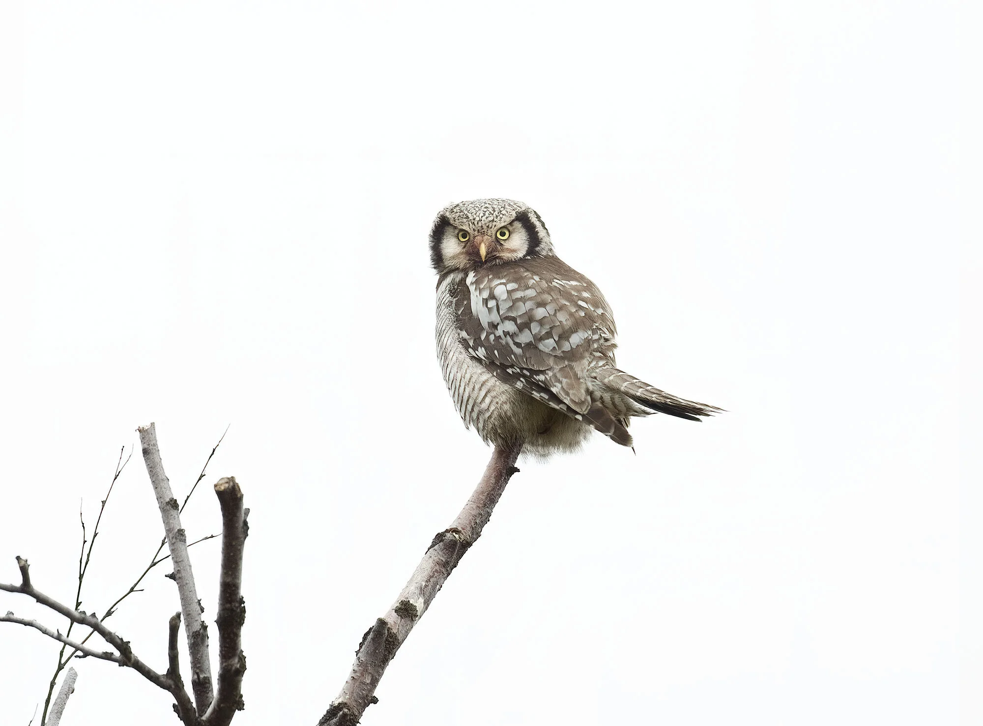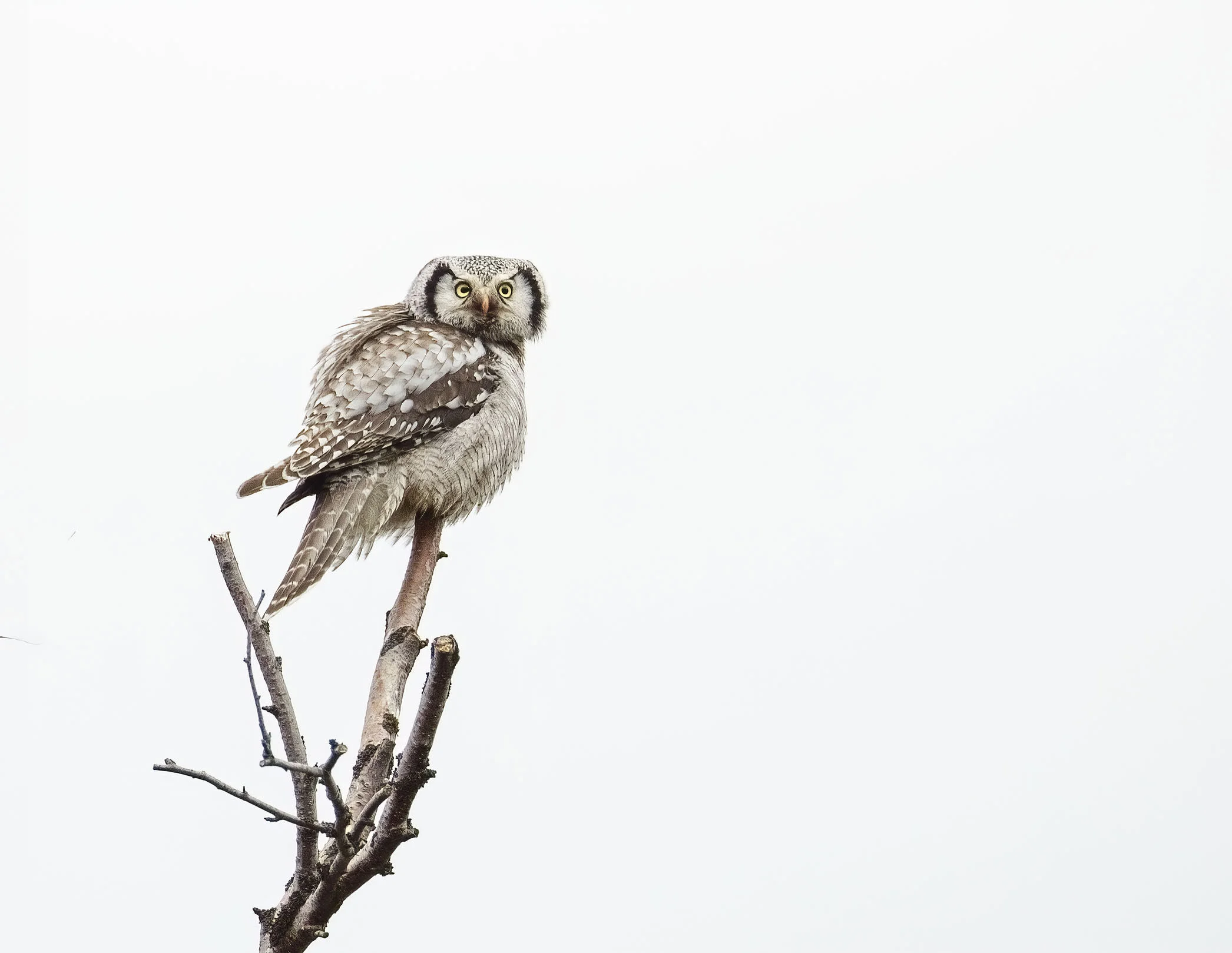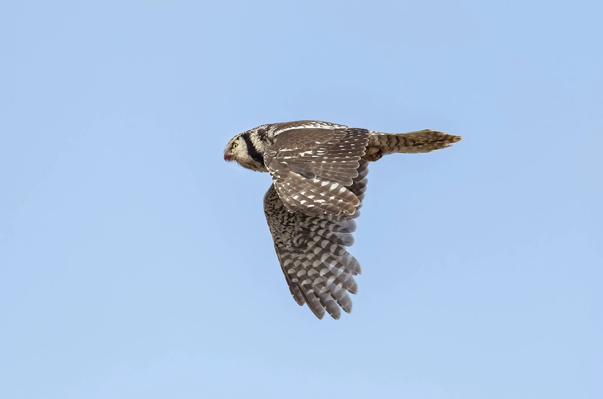 During a trip to Varanger in June 2012 we were fortunate to find there had been a bumper breeding season for Hawk Owls in the area with excellent vole numbers. In the course of the week in the area we came across six pairs with young most of which were out of the nest already but one nest at higher elevations on the road up towards the Batsfjord tundra still had young in the nest. The main problem for photography was that the weather was a bit dismal most of the time with a lot of thick cloud and some rain while the adults were often liberally blood splattered around the facial disk! Below is a selection of images from the week.