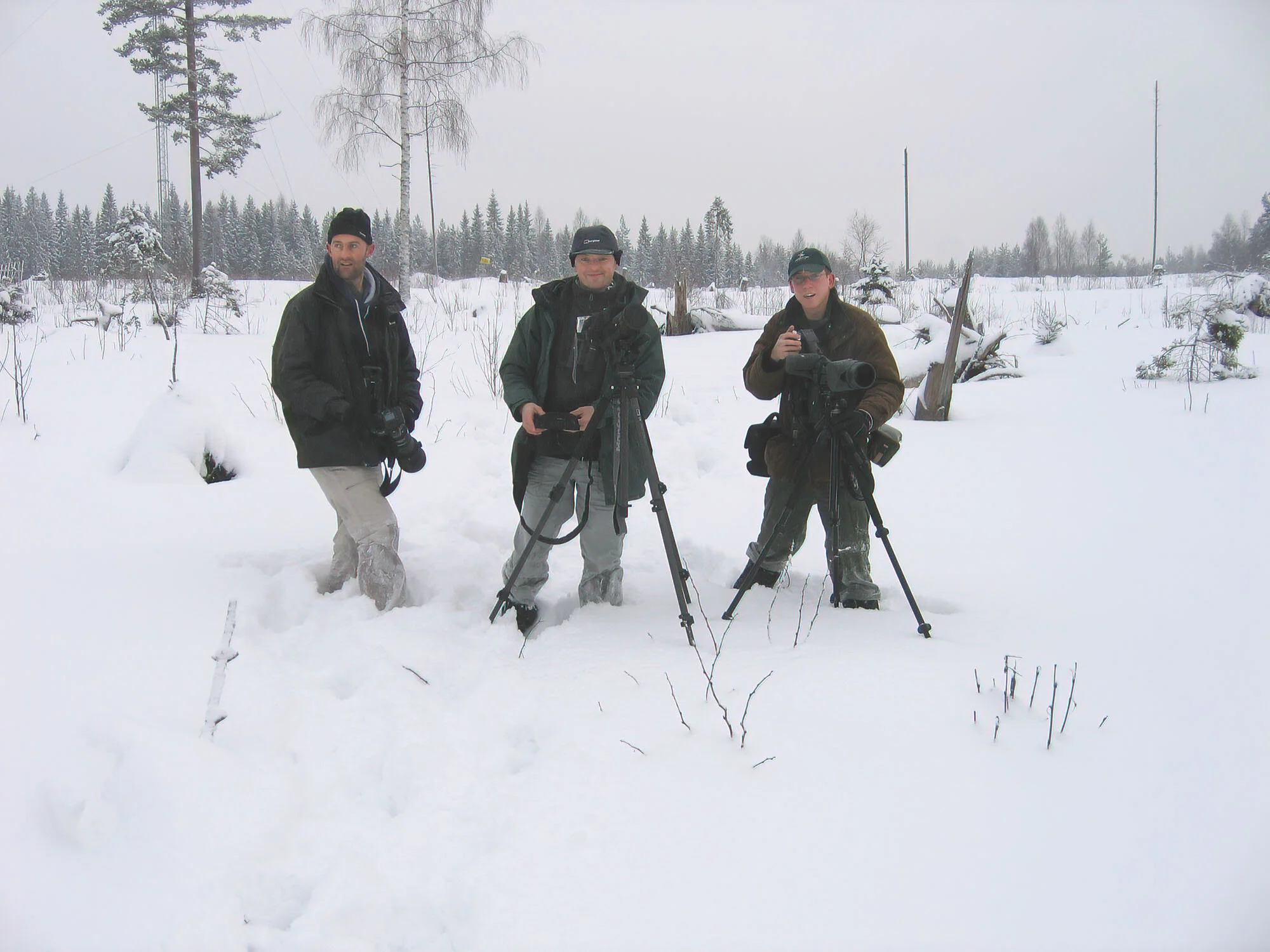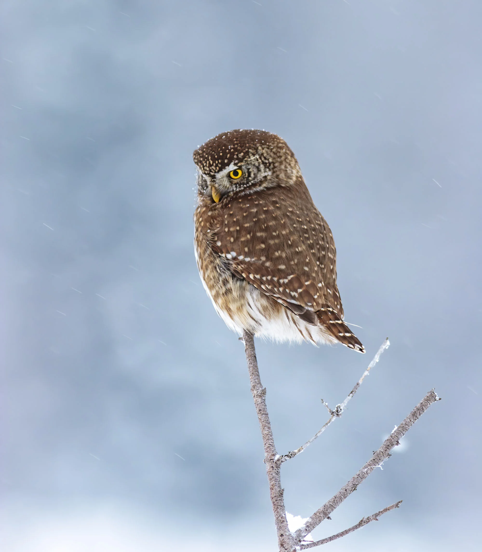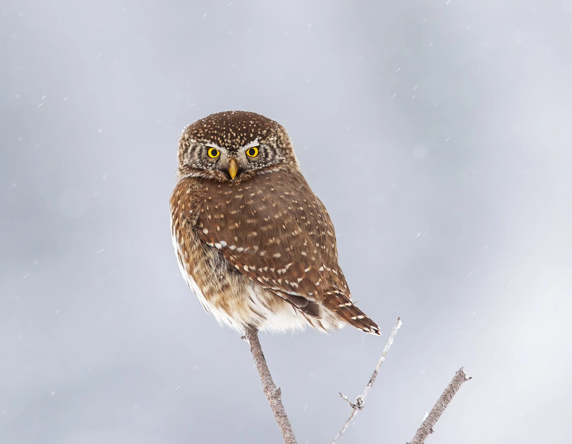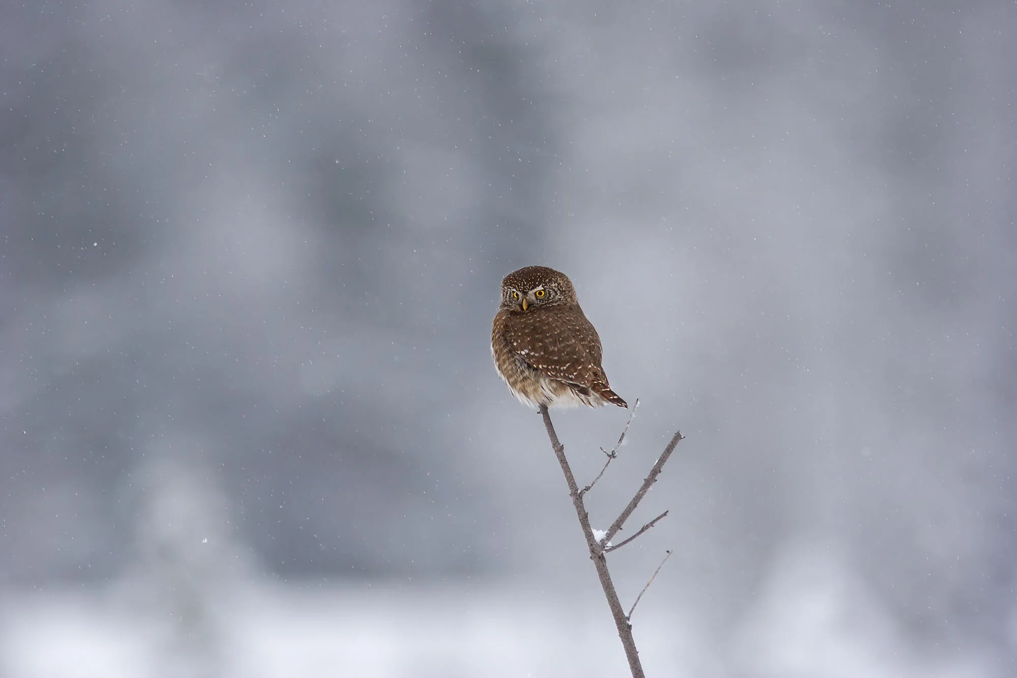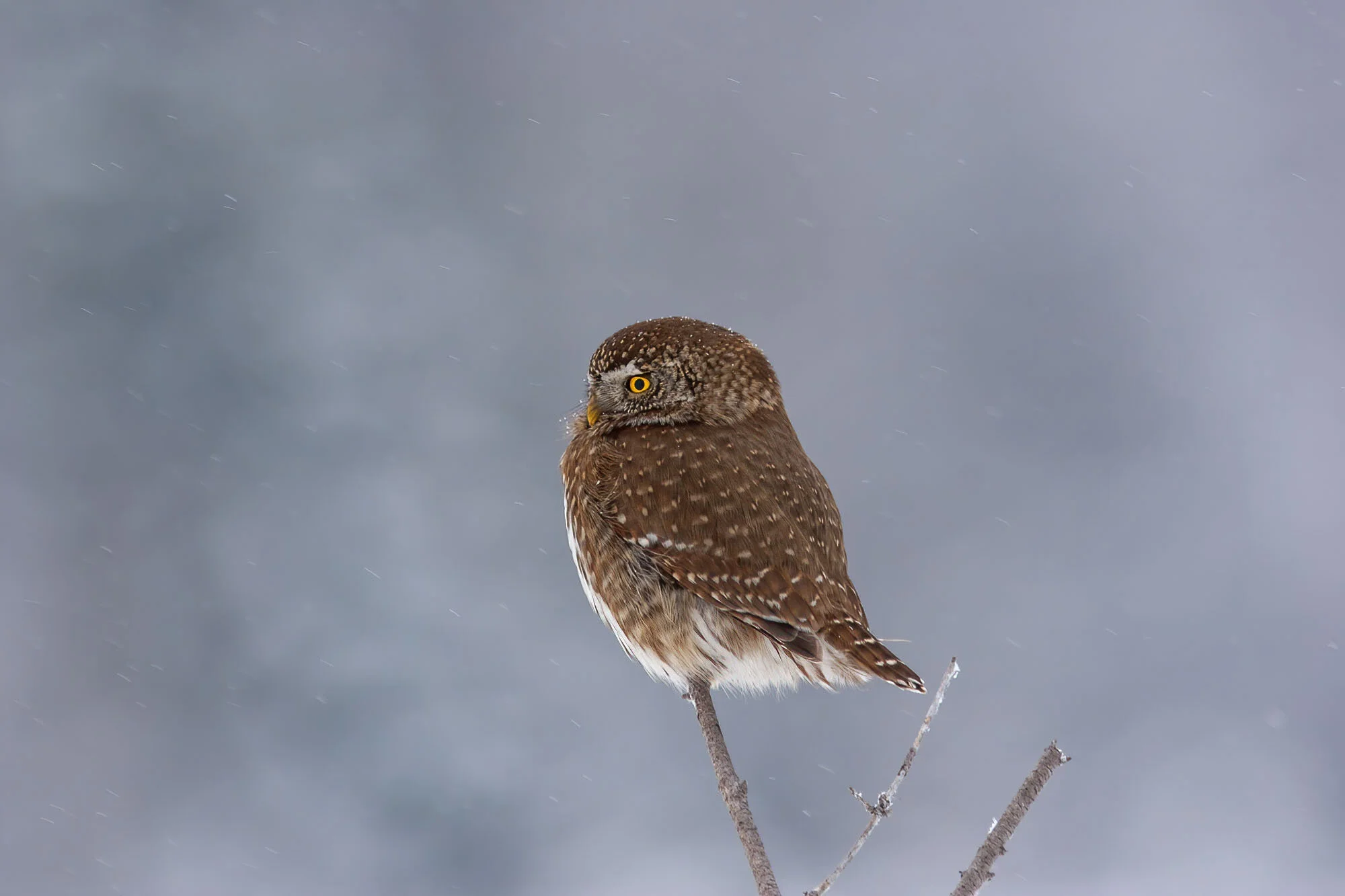 In February 2006 Dave Jenkins, Kev DuRose, Mark Bibby and myself were in central Sweden on a Danny Green photo tour specifically for Hawk Owls but anything else that was on offer in the snowy winter landscape. The regular Hawk Owl was less than approachable and often sat on rather unaesthetic pylons and thus we were driving the back roads in search of other species when we saw this Pygmy Owl perched on the top of a very high conifer by the roadside. As we abandoned the car, amazingly, it flew down and landed on a small branch protruding from the deep snow in a forest clear fell. After scoping it for a while it seemed settled so we set off across the snow to try and get some images but the snow was often thigh deep and with unpredictable ruts and holes you could easily have a snowy tumble but after several minutes of scrambling we got within reasonable range of this cracking little bird as the snow started to fall again adding a nice touch to the images.