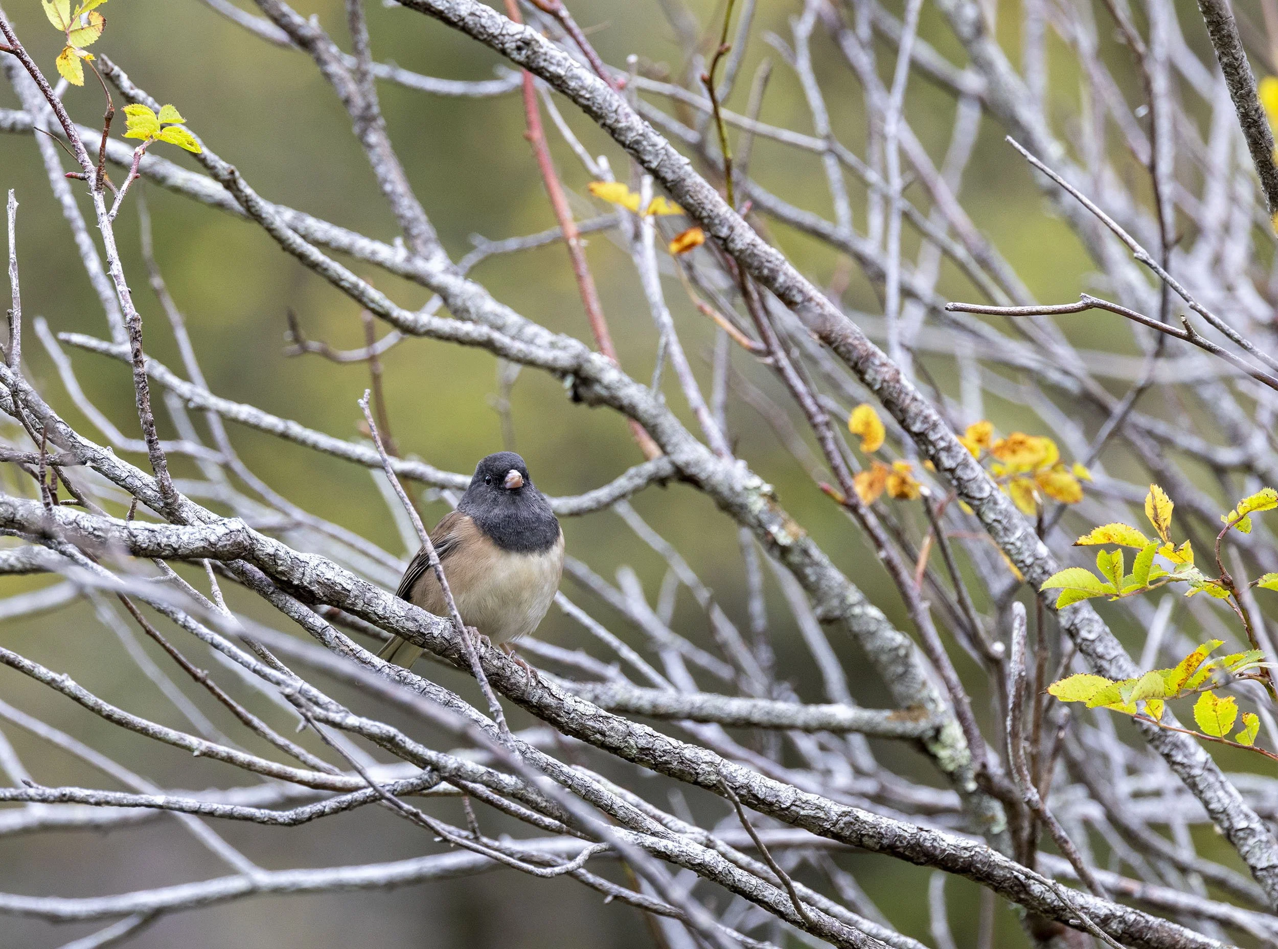 Oregon Junco replaced the Yellow Warbler on the same perch