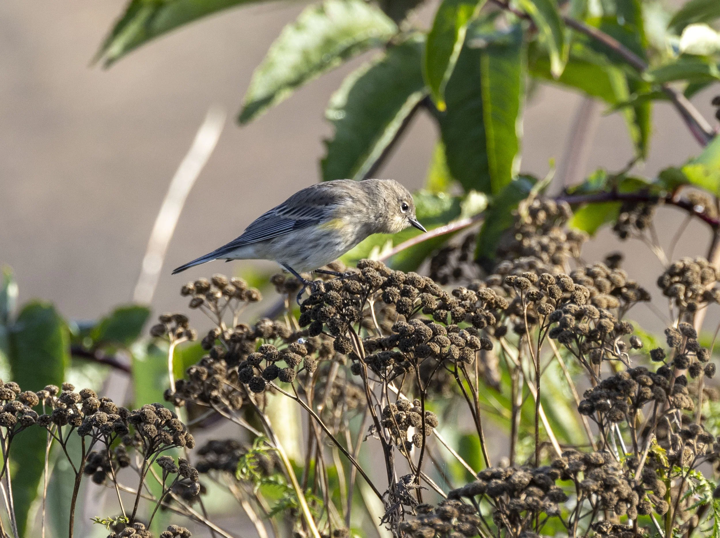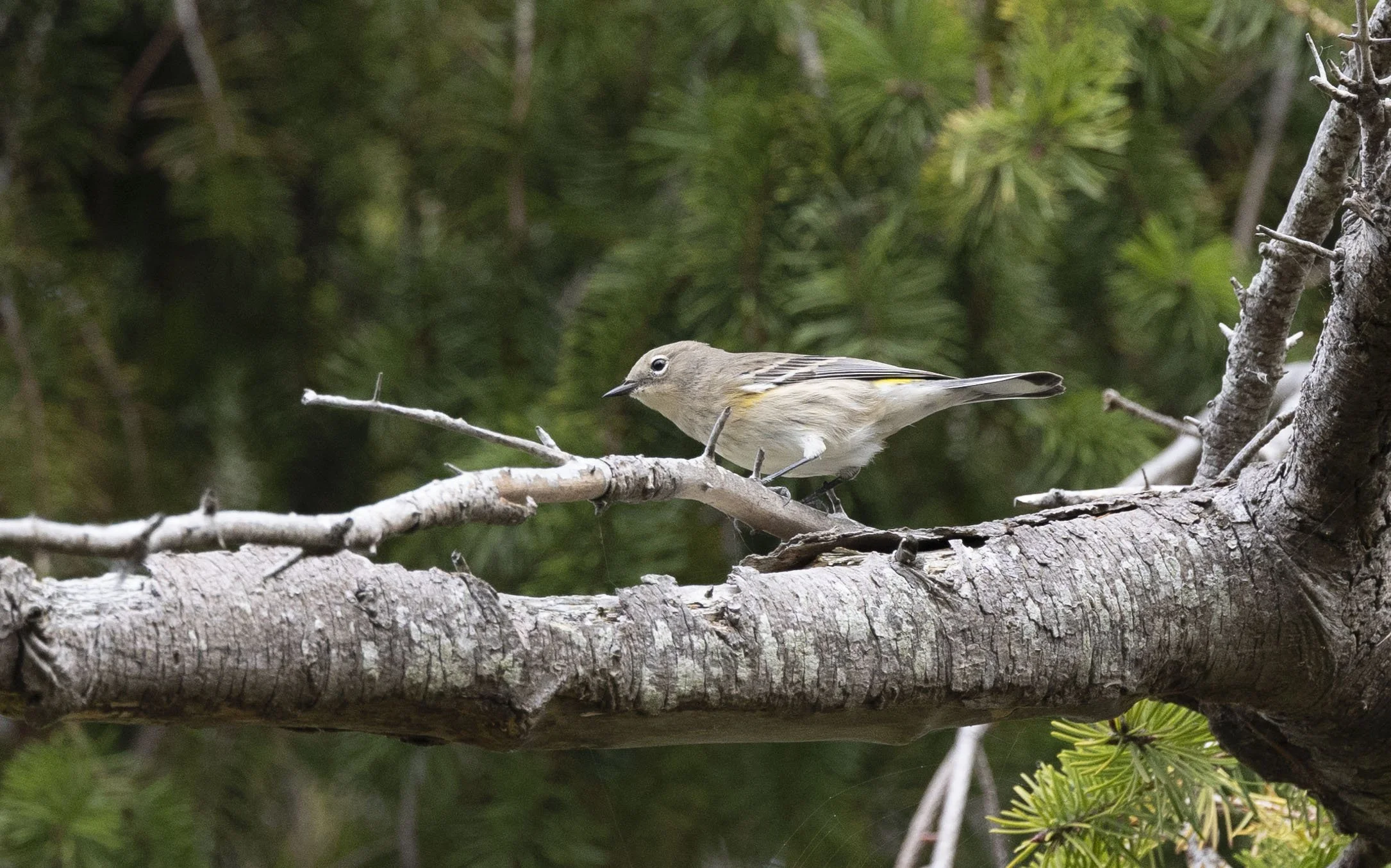 almost deleted this image as I could not see the bird in it then realised where it was - Audubon’s Warbler revealing the tail pattern and characteristic yellow rump