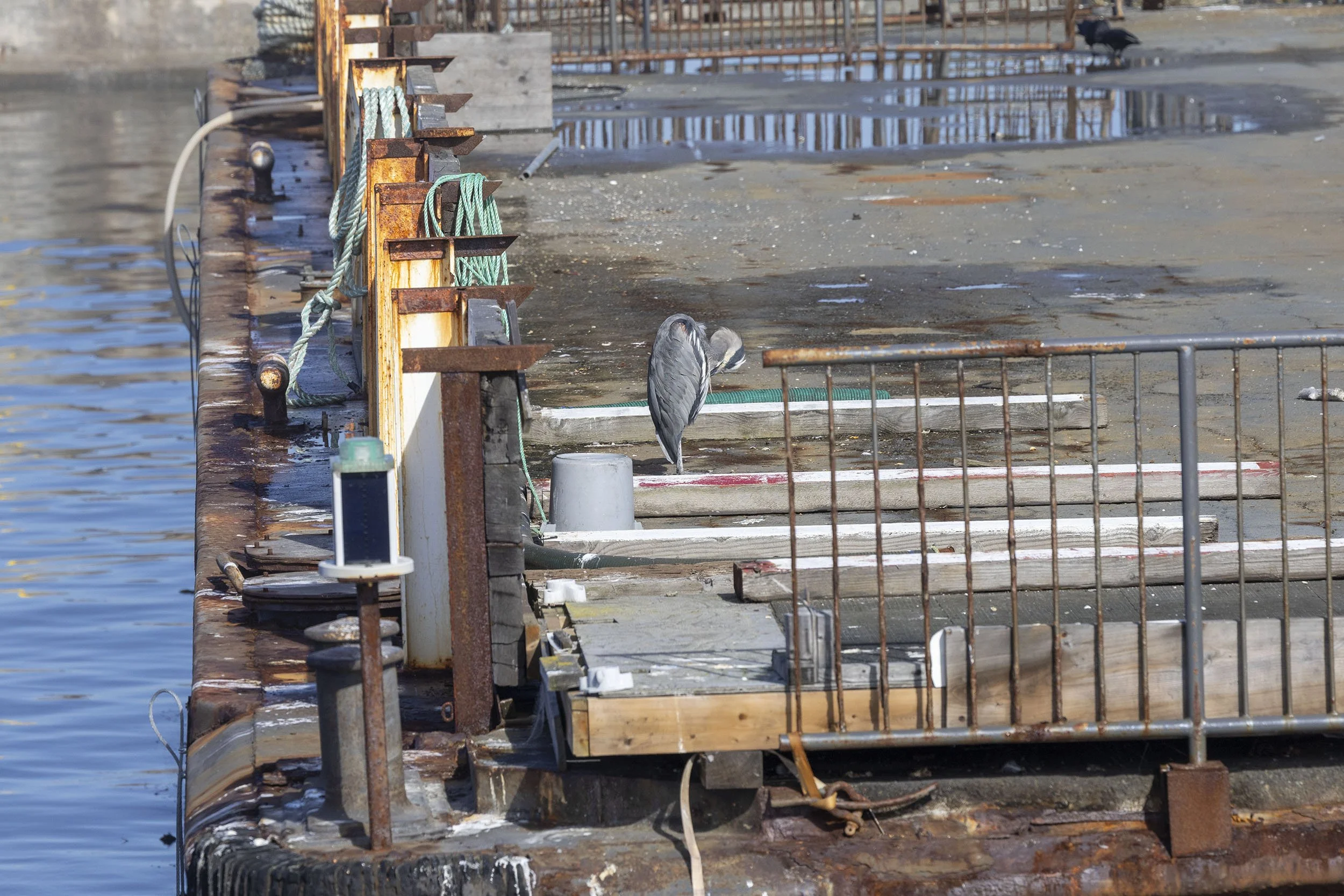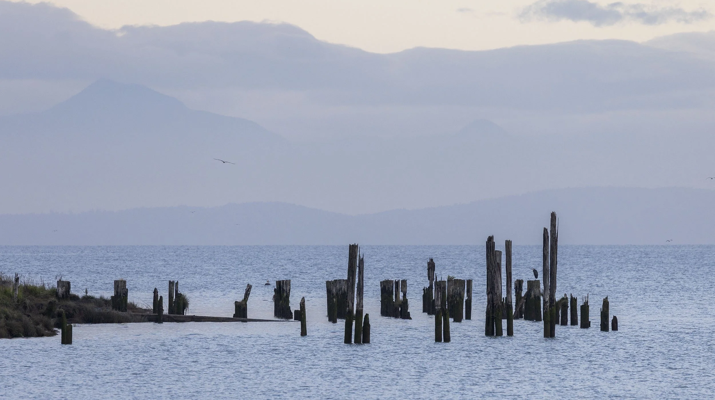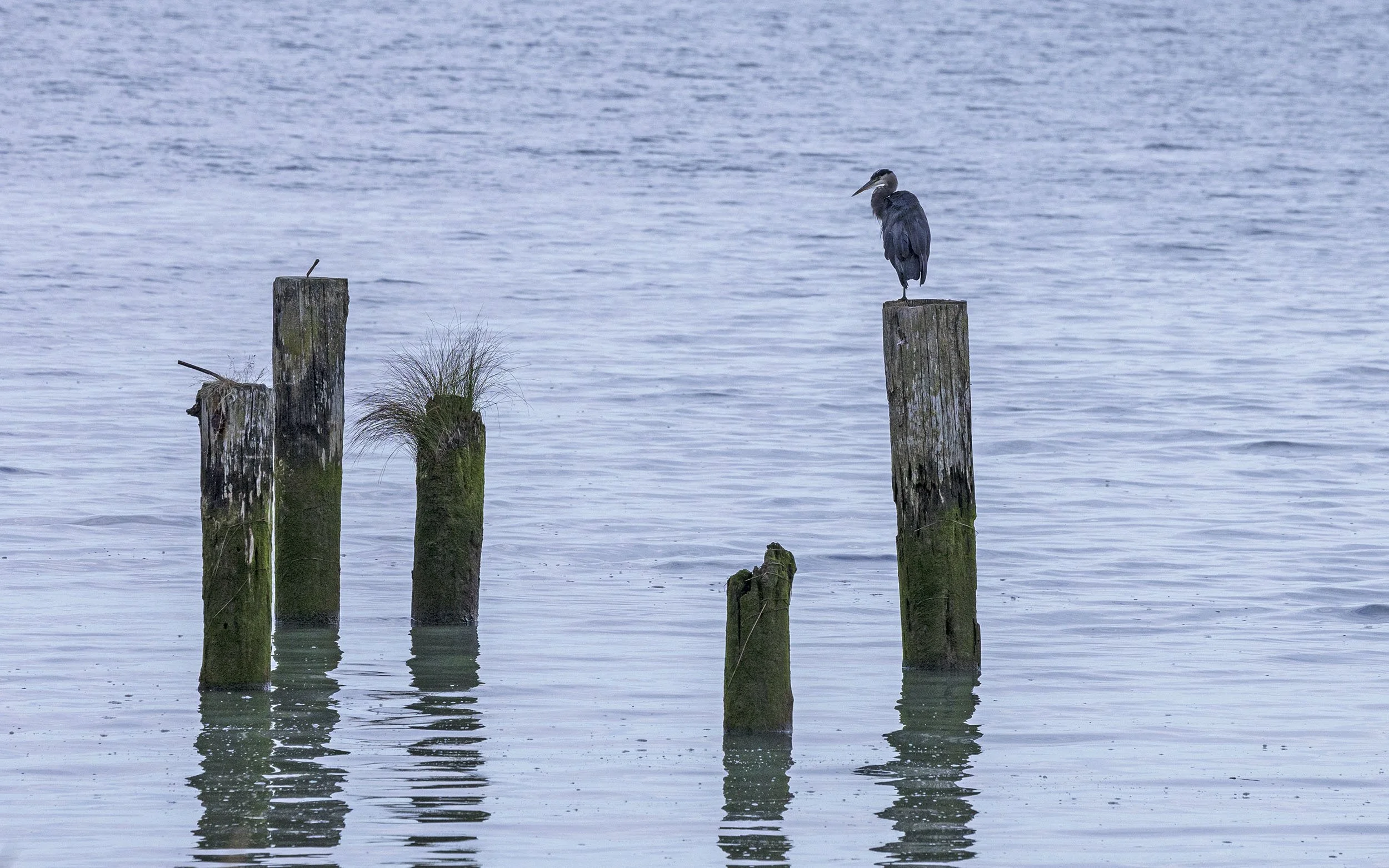 Great Blue Heron on old pier along the Fraser Dyke looking towards Vancouver Island