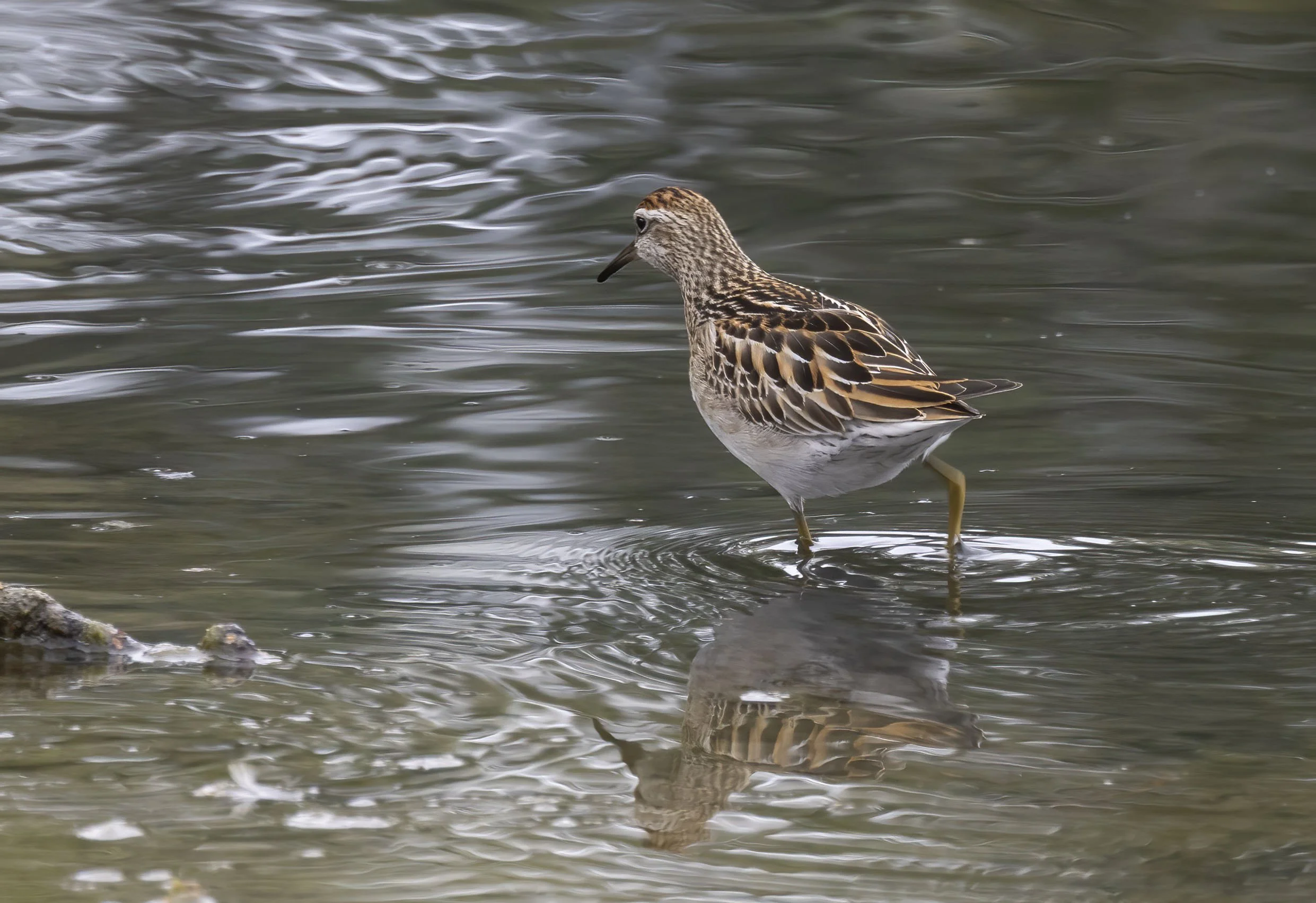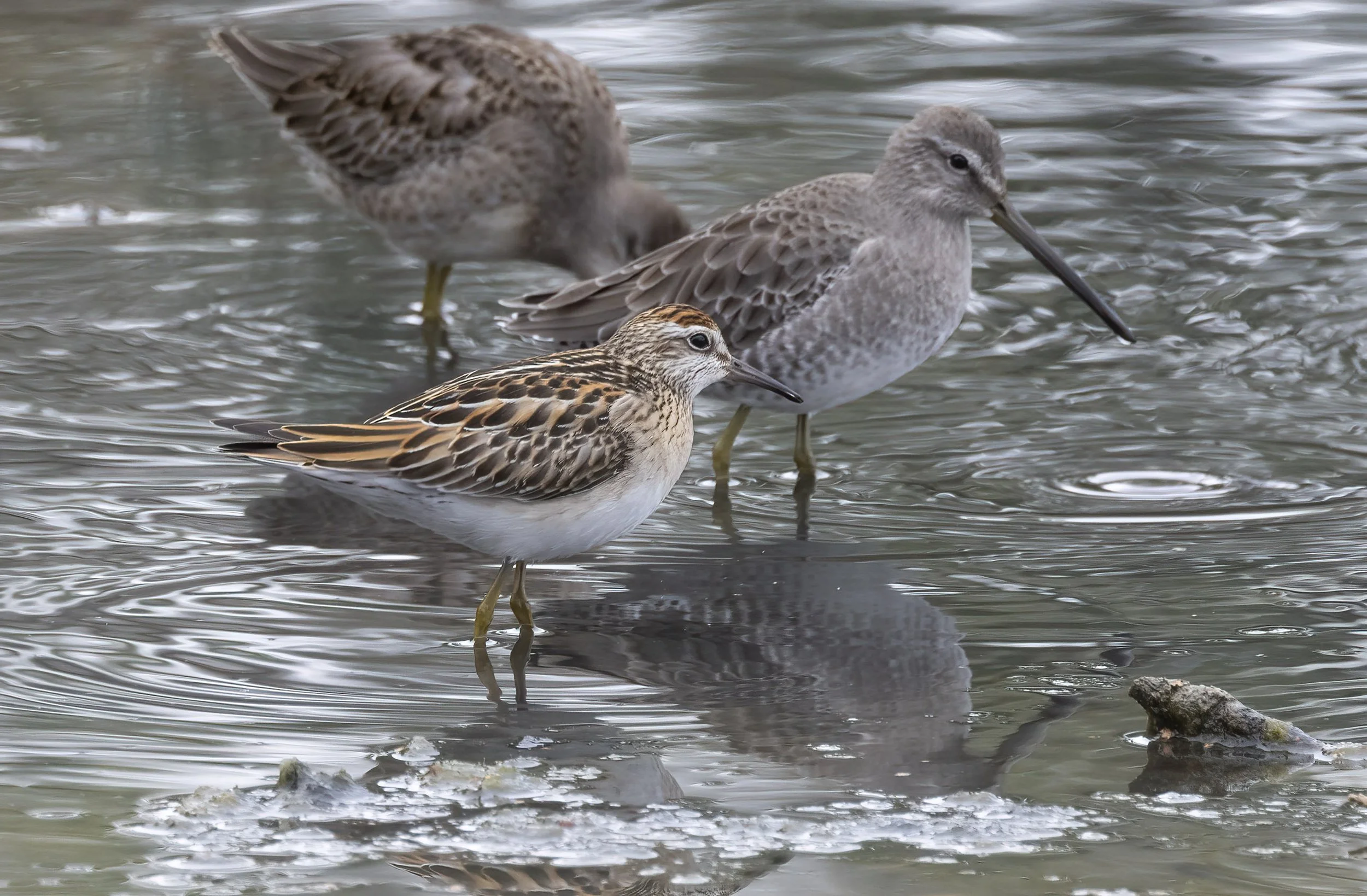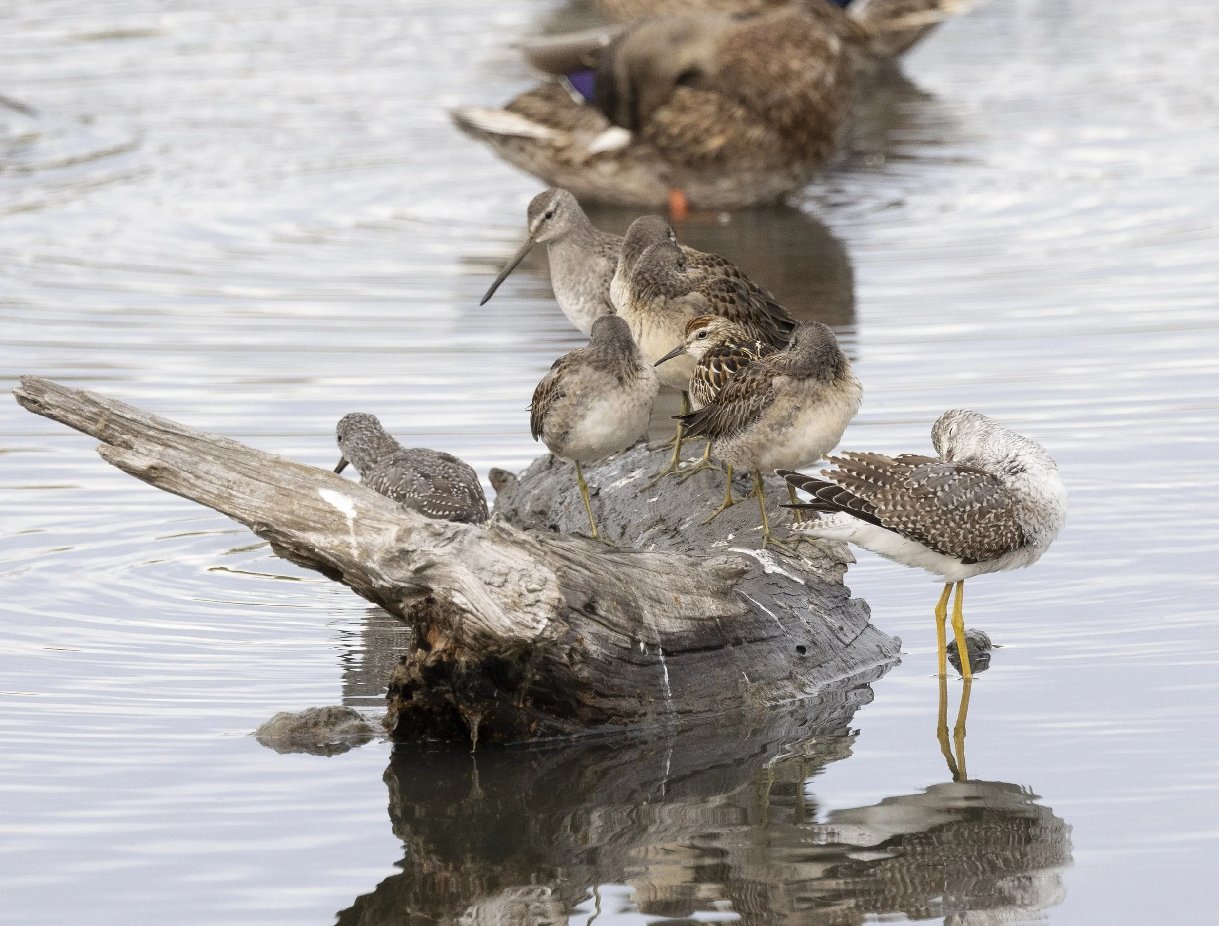 Initial view of the juvenile Sharp-tailed Sandpiper on the log hiding amongst Long-billed Dowitchers and Greater Yellowlegs