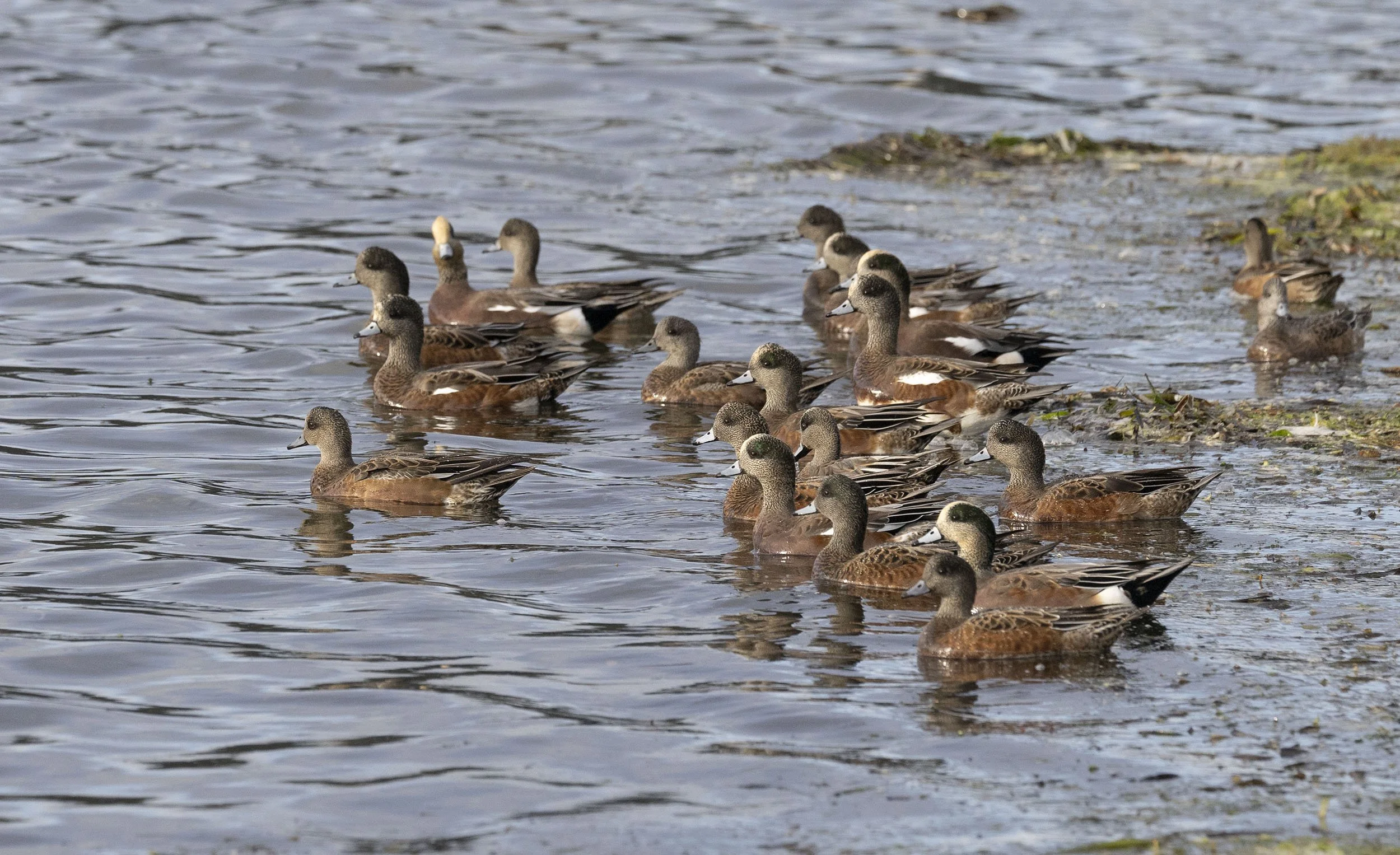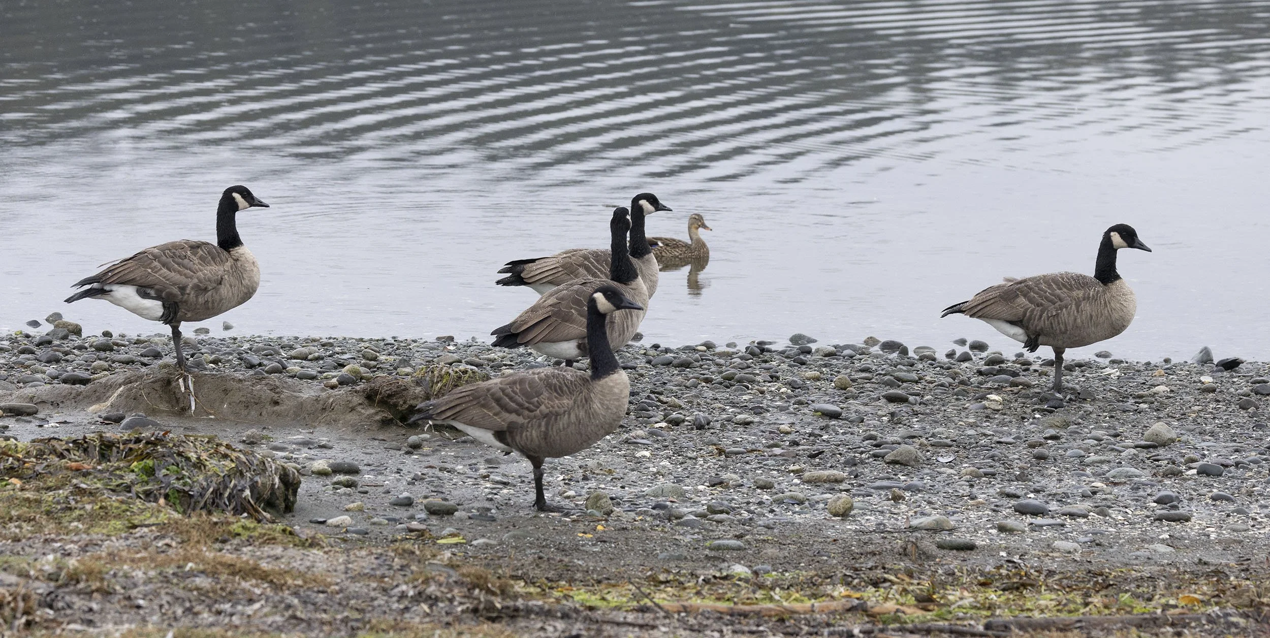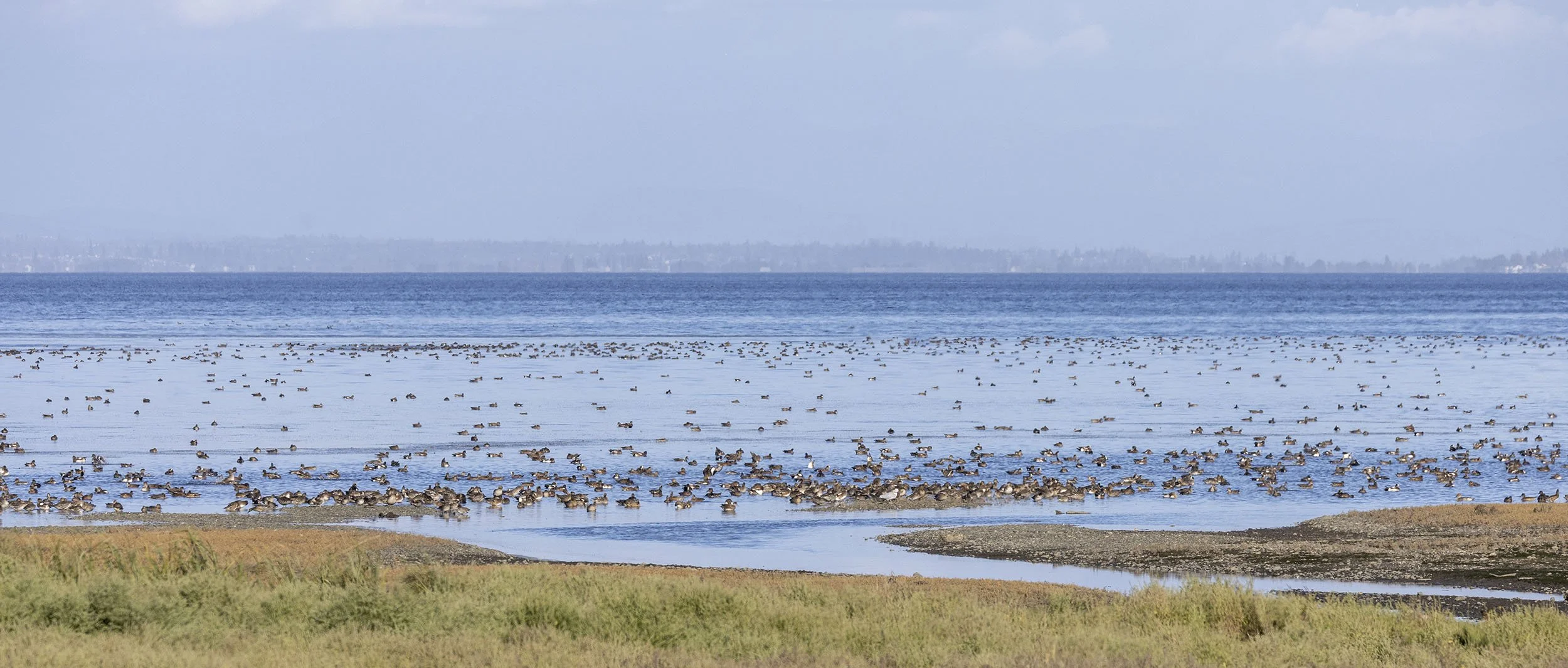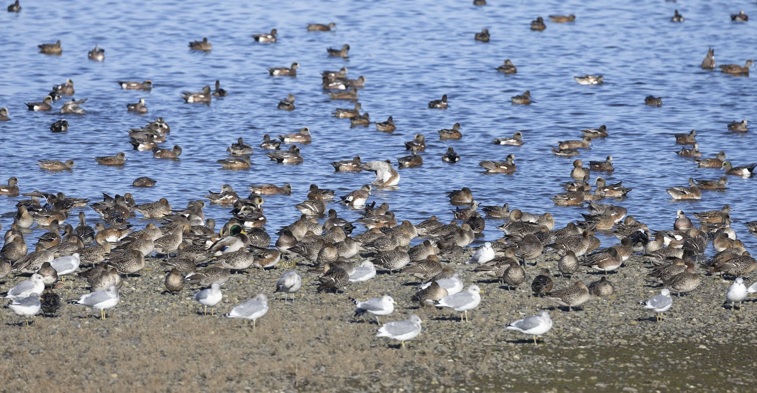 A typical spread of American Wigeon, Pintail, Green-winged Teal, Cackling Geese, Ring-billed and California Gulls at the river mouth Boundary Bay Park