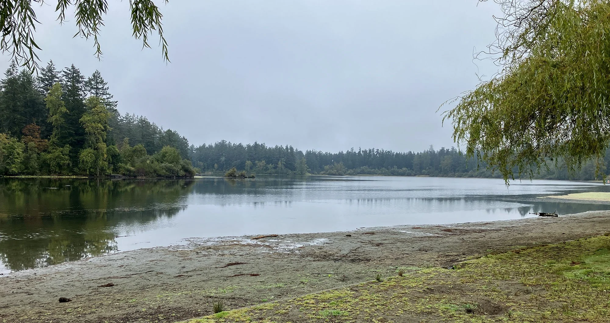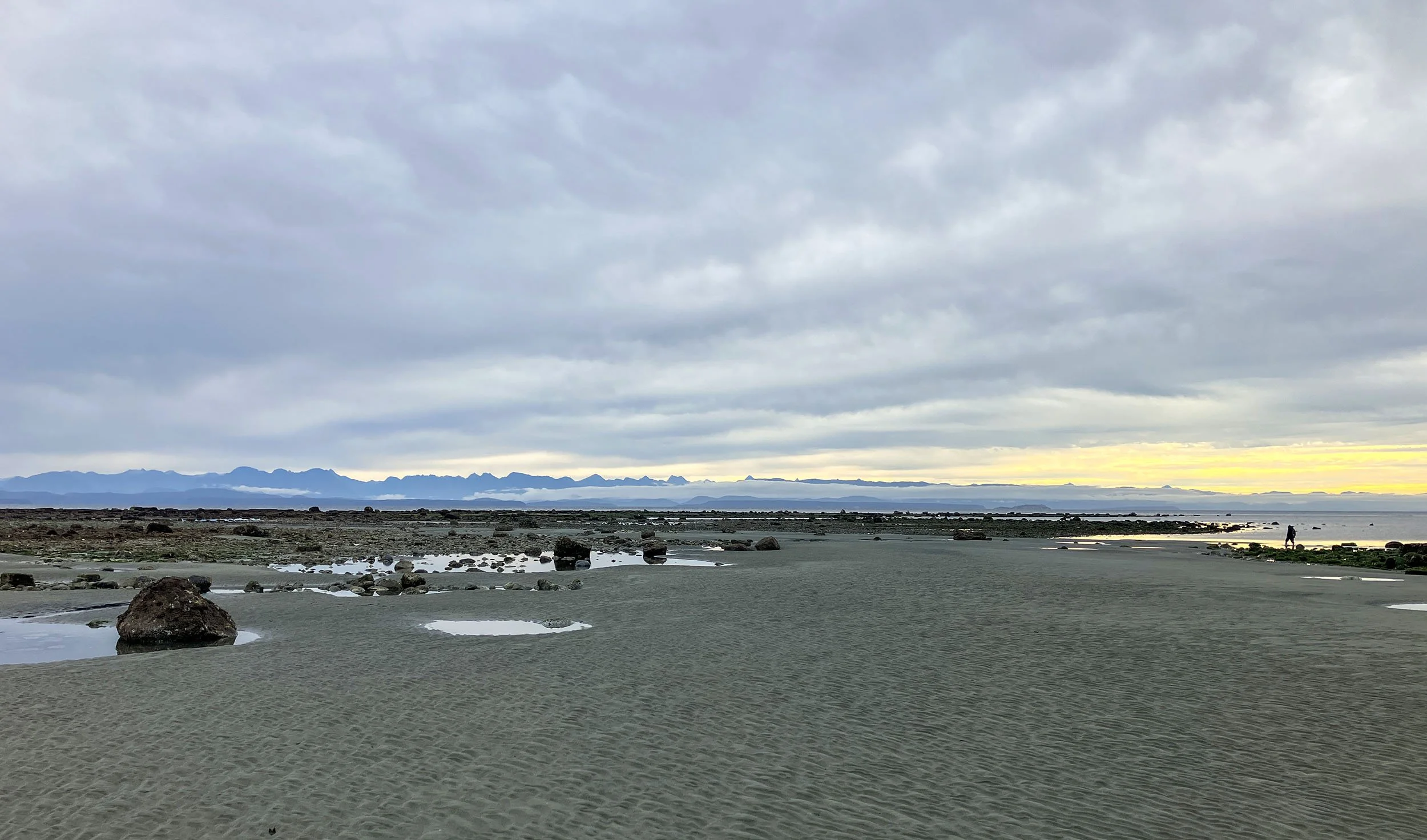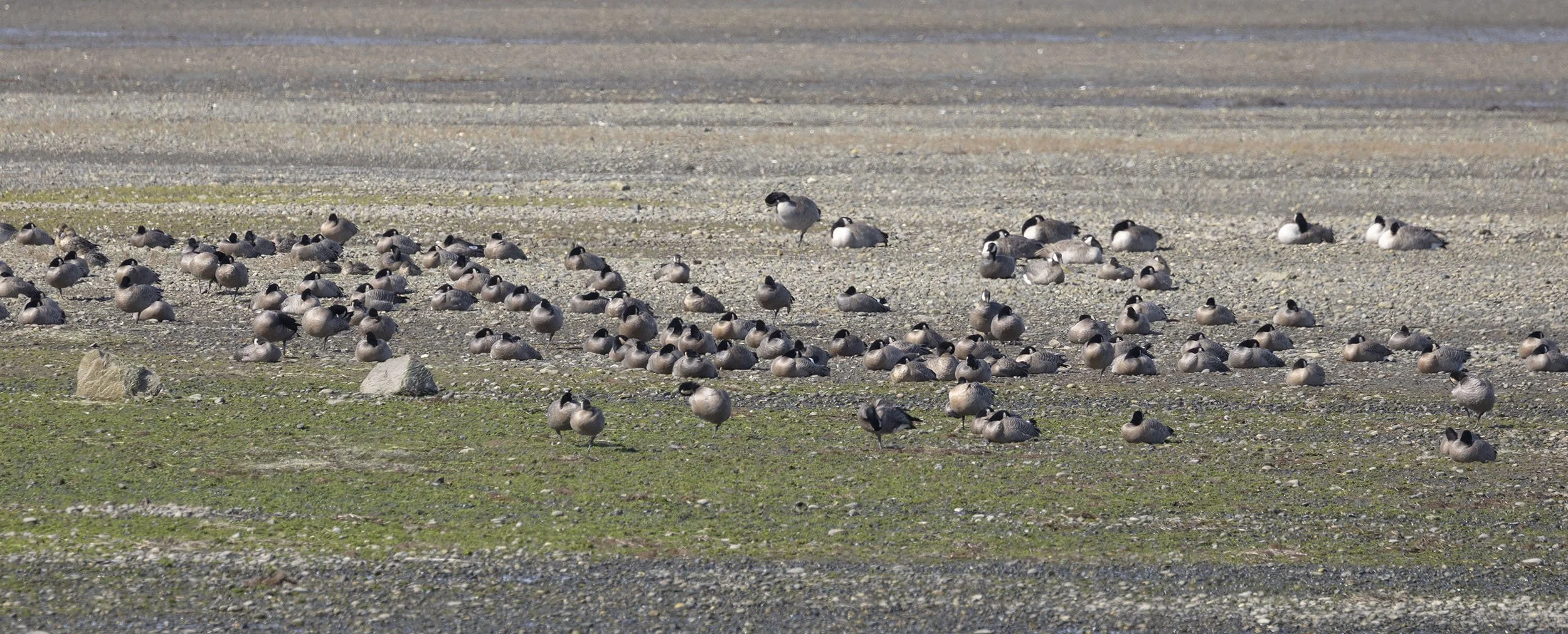 Boundary Bay Centennial Park at low tide looking towards Metro Vancouver - tidal conditions make a huge difference to views of birds as the bay is so shallow when the tide goes out quickly there are soon 100’s of metres of mud between the shore and water’s edge - flock of sleeping cackling geese in the mid distance
