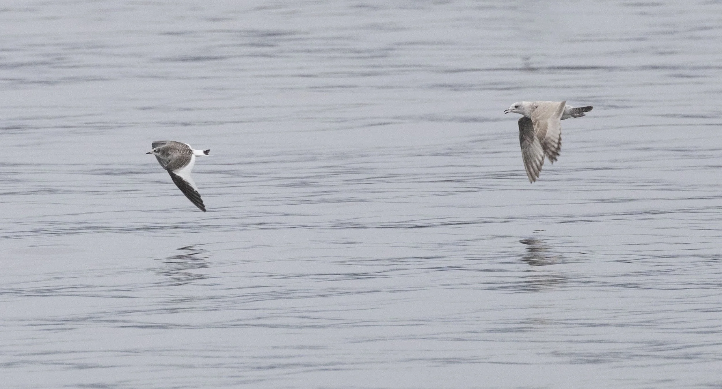 first-winter Mew Gull chasing juvenile Sabine’s Gull - one of three juvenile Sabine’s in the evening gull gathering off the spit