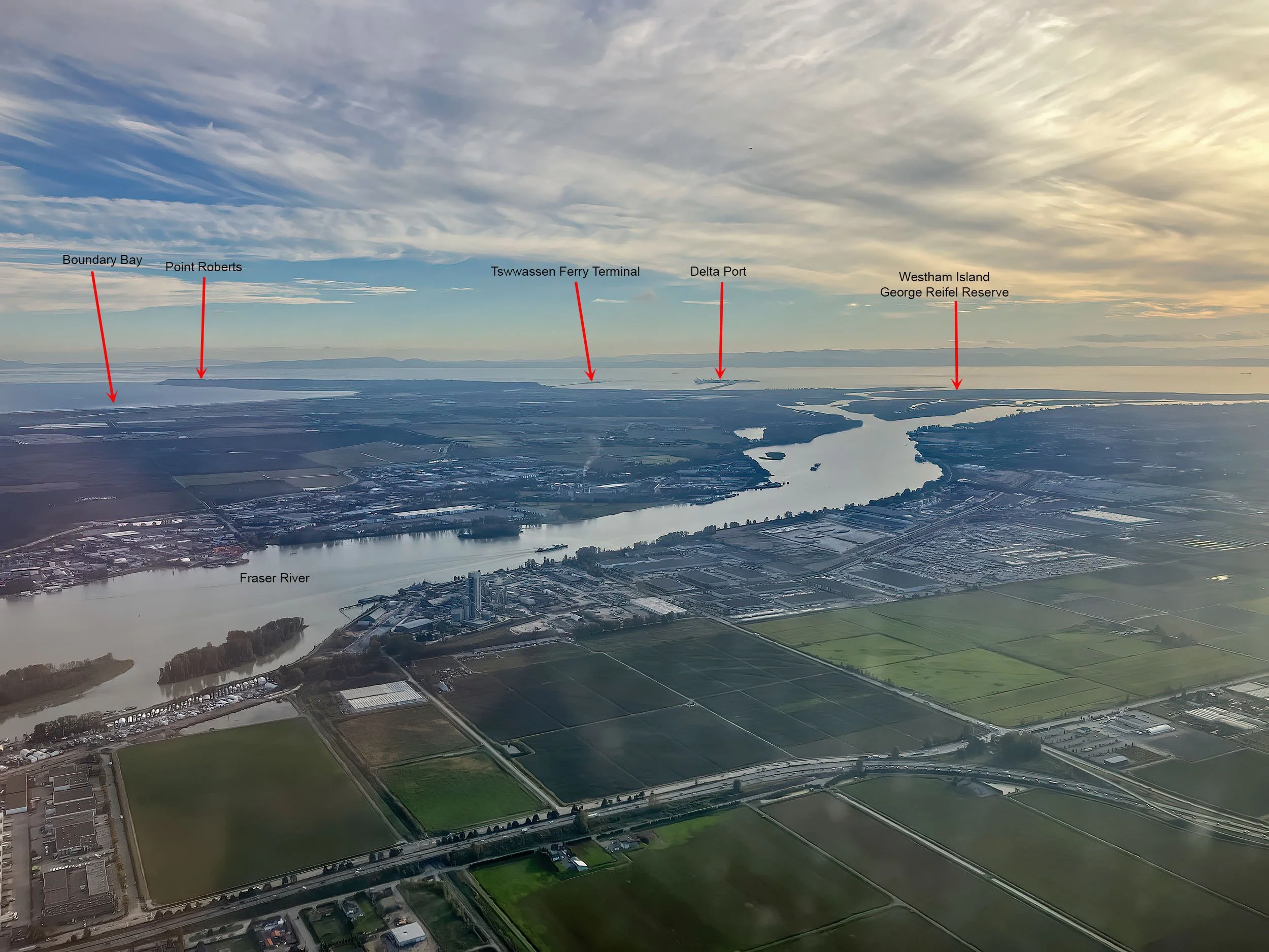 Friday 20th we travelled to Cheshire on the 19th for our early afternoon flight to Rejkavik, a bit late but the connection to our Vancouver flight was seamless and we were on the way to Canada by early evening. The staff were excellent and a good flight saw us passing over the south end of Greenland and Baffin Island where a few iphone shots of the scenery were taken through the window - note to self buy a better iphone with a better camera. Flight arrives at Vancouver 17:45 and get through customs and baggage reclaim quickly picking up our pre-booked car from Hertz, again a good experience. We booked a medium SUV but ended up with a seemingly rather large GMC SUV. The 11 year old sat nav amazingly works and we drive 15 minutes to a very strange B&B in Richmond taking a late walk along the Fraser river where gulls, Song Sparrows and a flock of 10 squawking Caspian Terns were seen before darkness at 19:20.