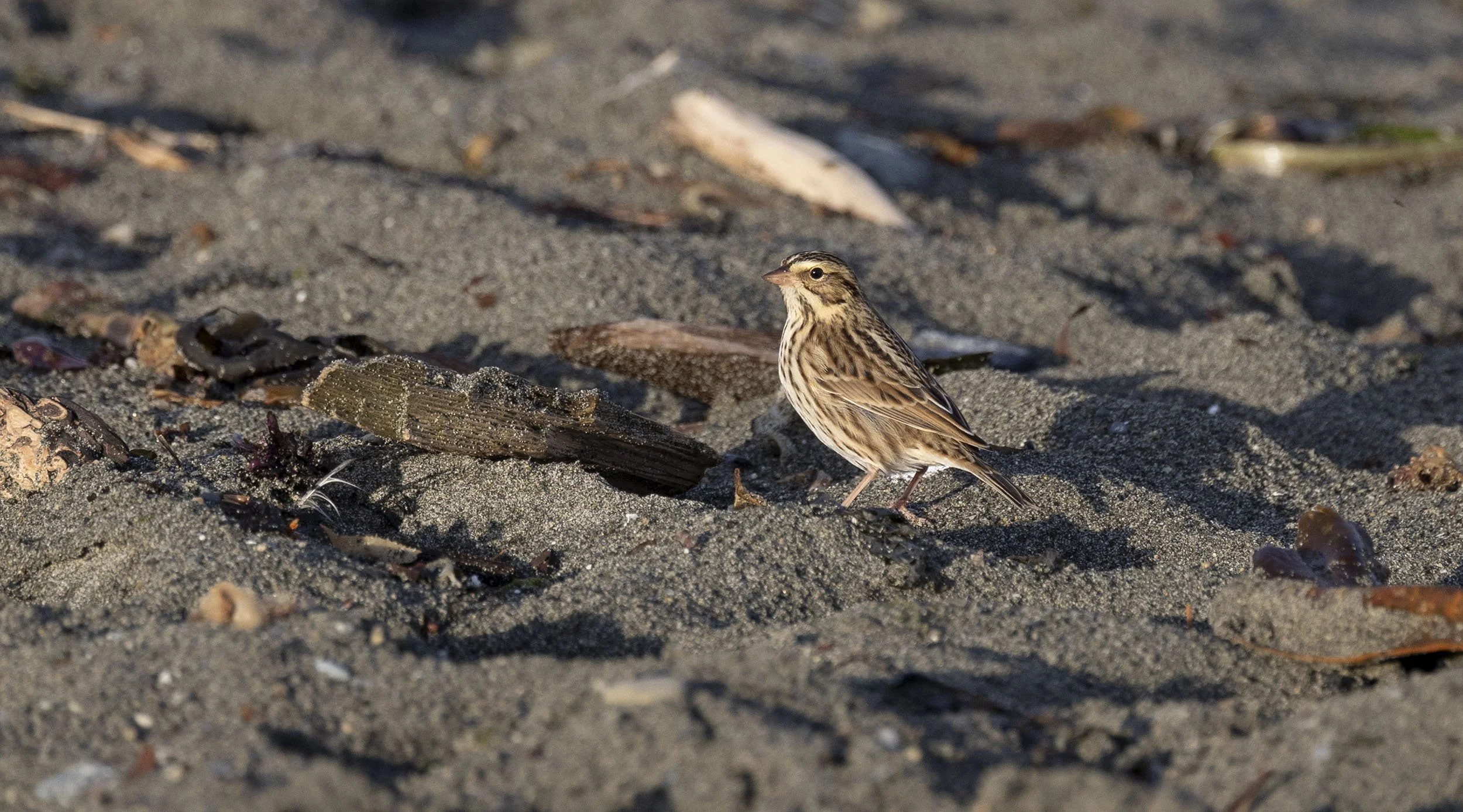 Boundary Bay Centennial Park the sandy areas with washed up tree debris are a good feeding area for Savannah Sparrows